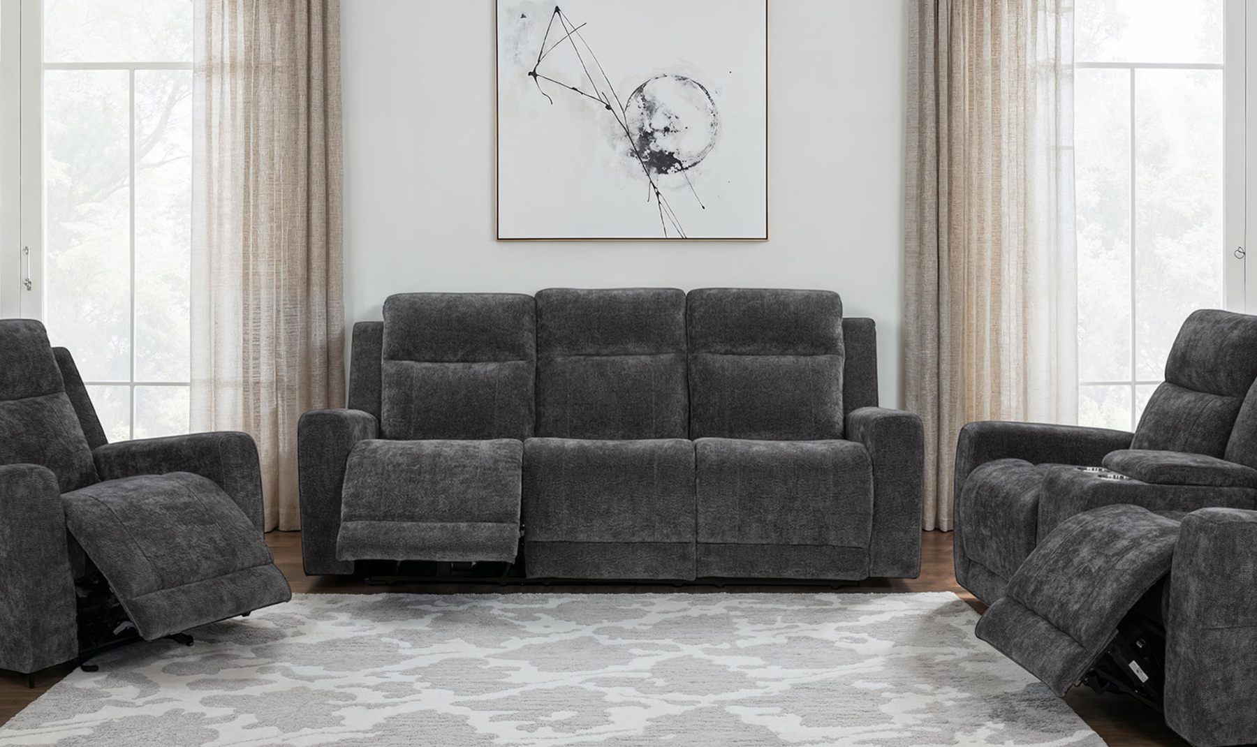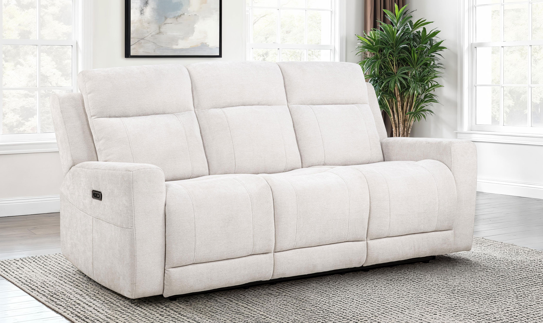Sink into exceptional comfort with this elegantly designed chenille power reclining sofa, where modern convenience meets everyday relaxation. Upholstered in soft ivory chenille with a subtle woven texture, this sofa creates a warm and welcoming atmosphere while adding a refined touch to your living space. Smooth dual power recliners allow you to effortlessly adjust your seating position at the push of a button, making it easy to find your perfect level of comfort.