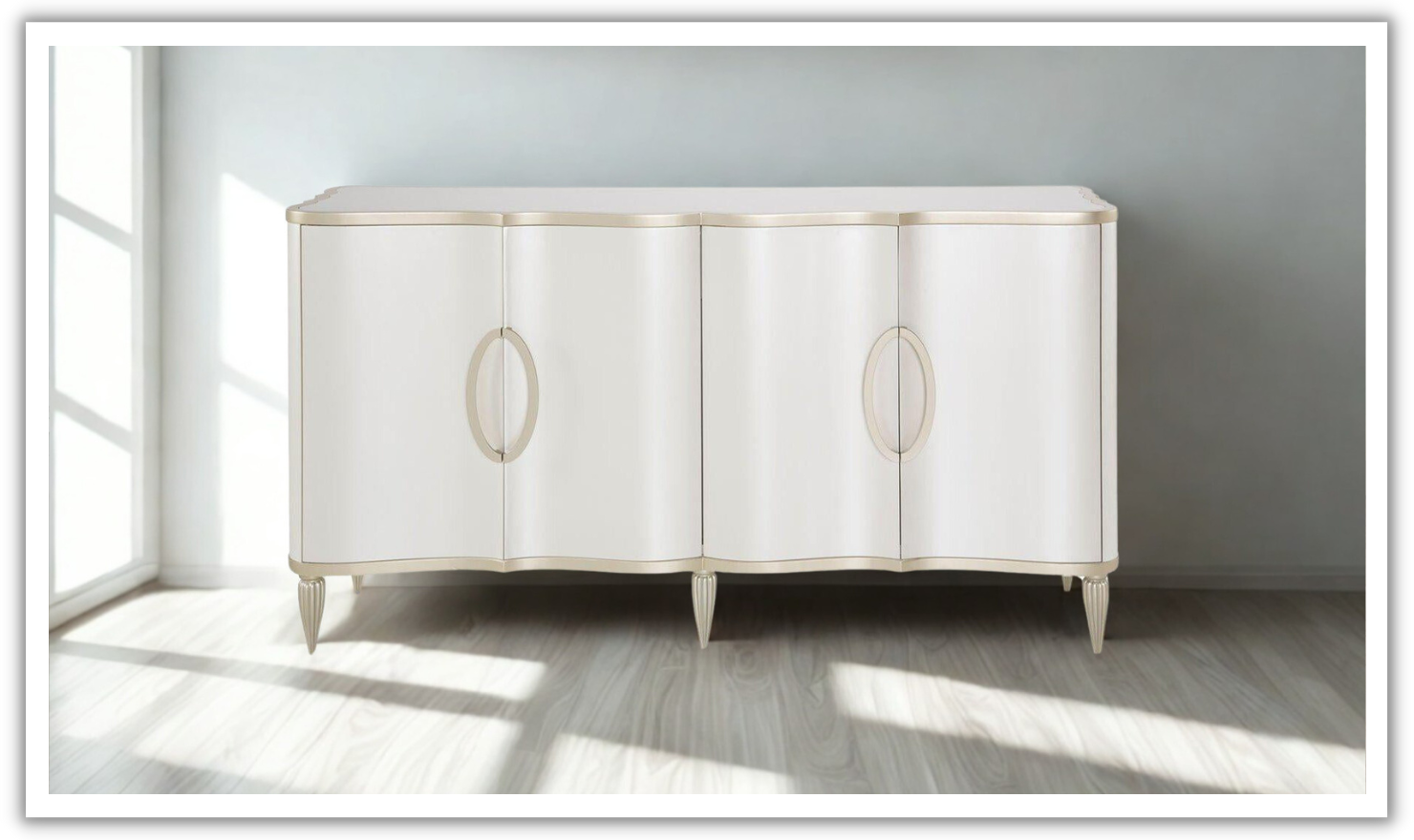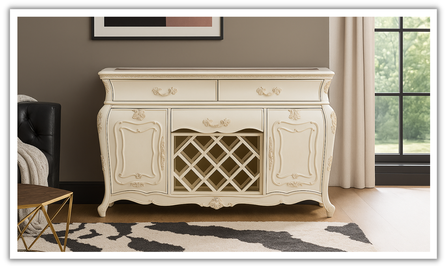 The Universal Furniture Coalesce Beige Madden Sideboard is a refined storage piece built with both function and form in mind. Crafted in the subtle Rolling Fog finish, its exterior features clean geometric carvings that add texture without overwhelming the room. Behind its quietly elegant appearance lies a practical interior, offering organized storage that suits both everyday use and occasional entertaining.