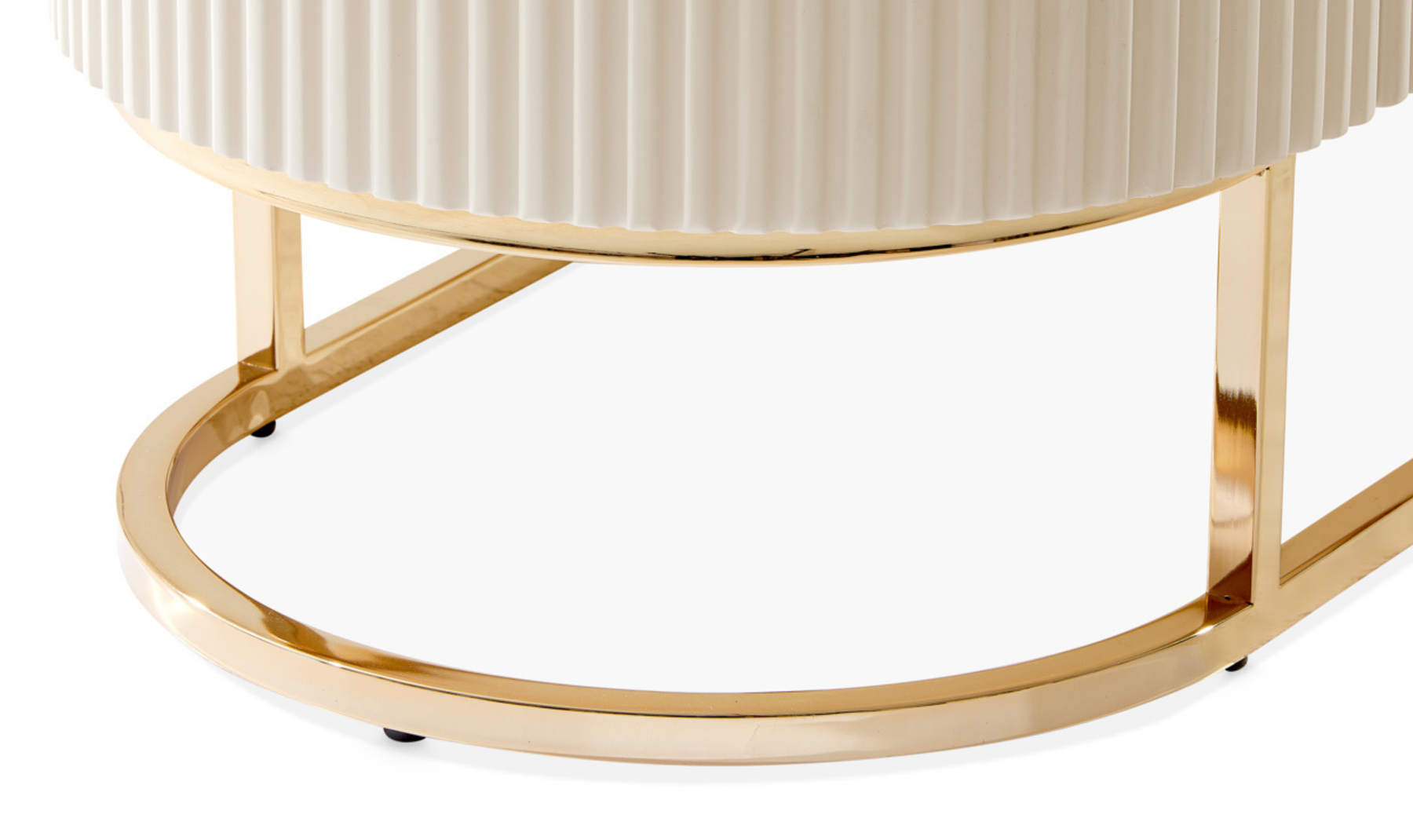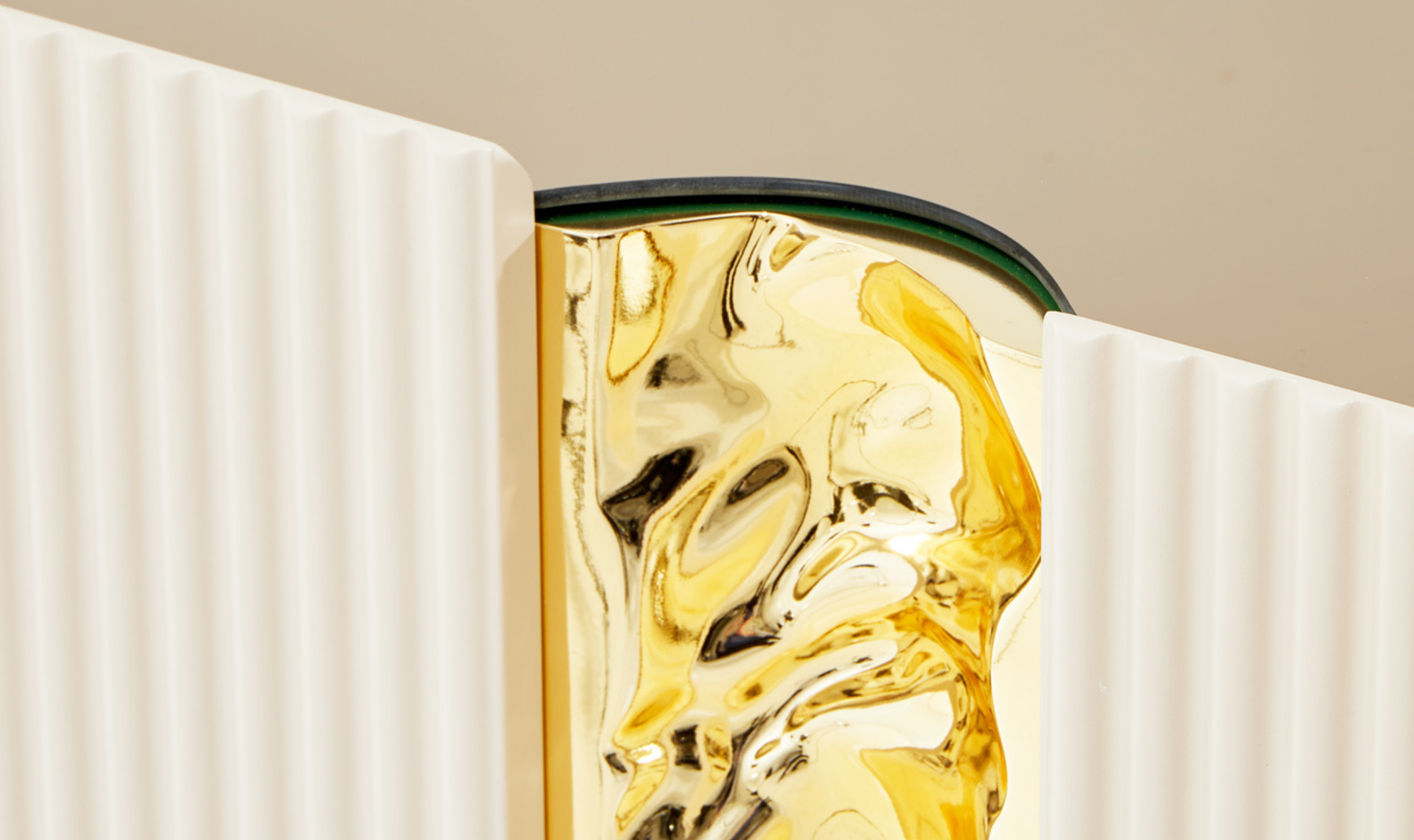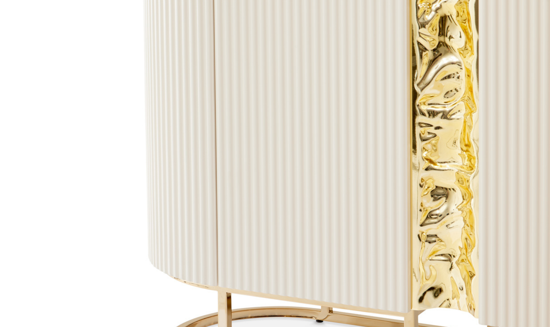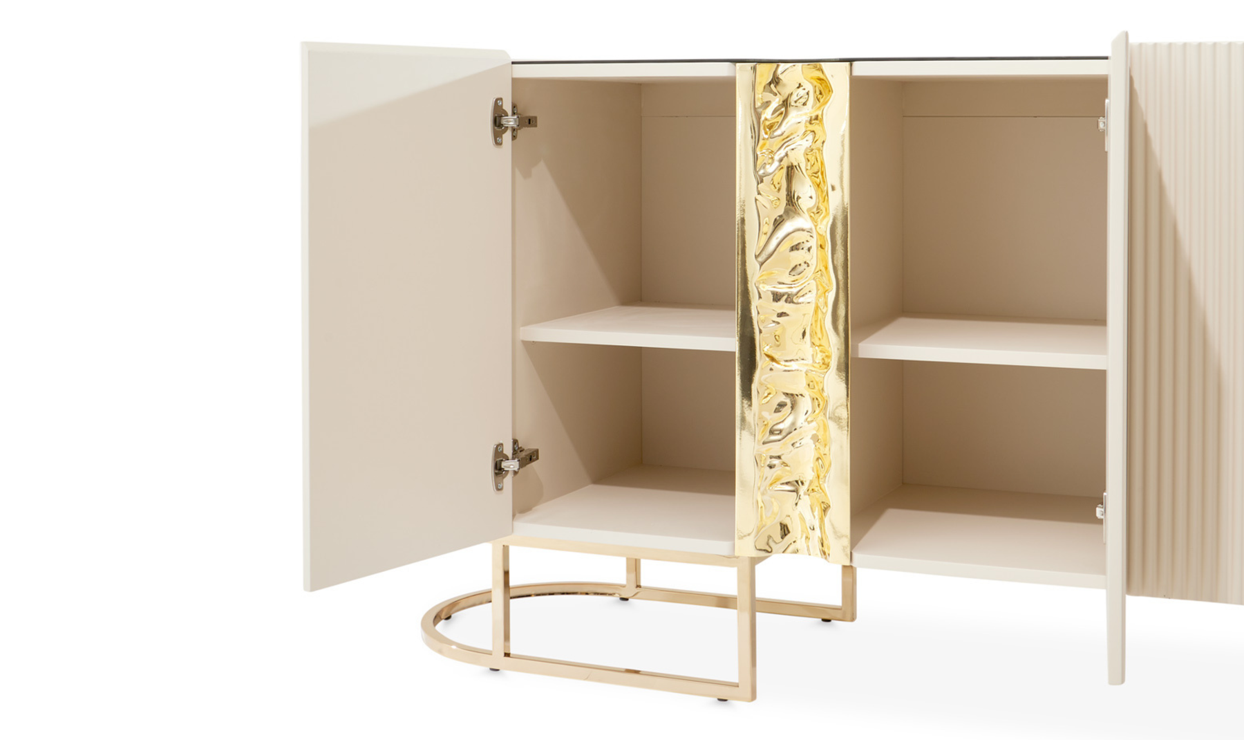 At its heart, a sculptural gold accent panel draws attention with a liquid-like sheen that catches light beautifully from every angle. Beneath its elegant exterior lies thoughtful storage six hidden compartments and a discreet drawer that keep surfaces clutter-free. Whether used in an entryway, dining area, or living room, the Lisbon Console Table enhances its surroundings with poise, refinement, and a sense of understated artistry.