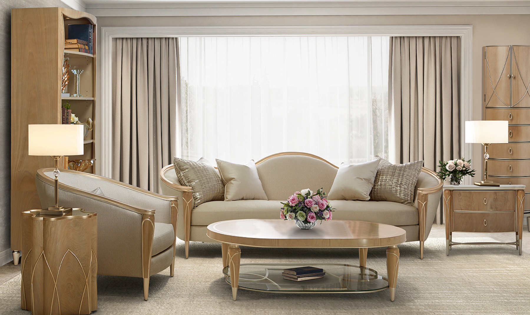 Built with both display and function in mind, the bookcase includes LED touch lighting that illuminates its glass shelving, highlighting collectibles or books with a subtle glow. The inner trim features gently flowing lines, adding depth to the overall silhouette. Whether placed alone or grouped together, the Villa Cherie Bookcase creates a cohesive and polished appearance in any study, living room, or library setting.