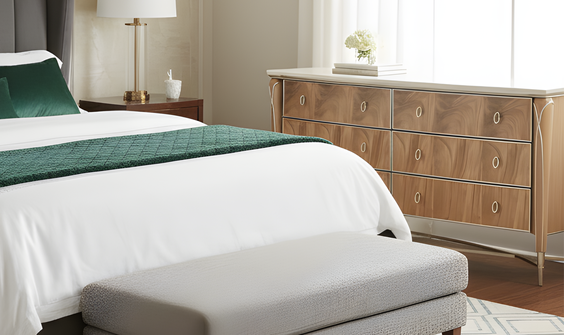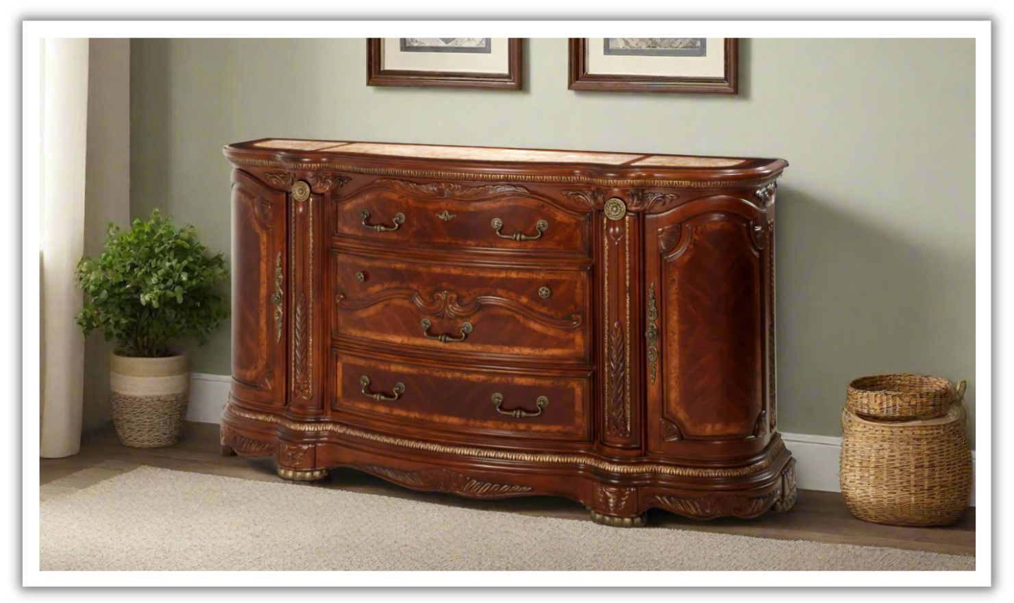 The AICO Villa Cherie Dresser in Caramel combines traditional design elements with functional storage for an organized bedroom or dressing area. Its features six drawers lined with velvet and equipped with soft-closing glides, offering secure storage for clothing and personal items. The top surface is crafted from cultured marble, providing a durable and elegant workspace, while the bottom right drawer includes a hidden false-bottom compartment for added privacy.