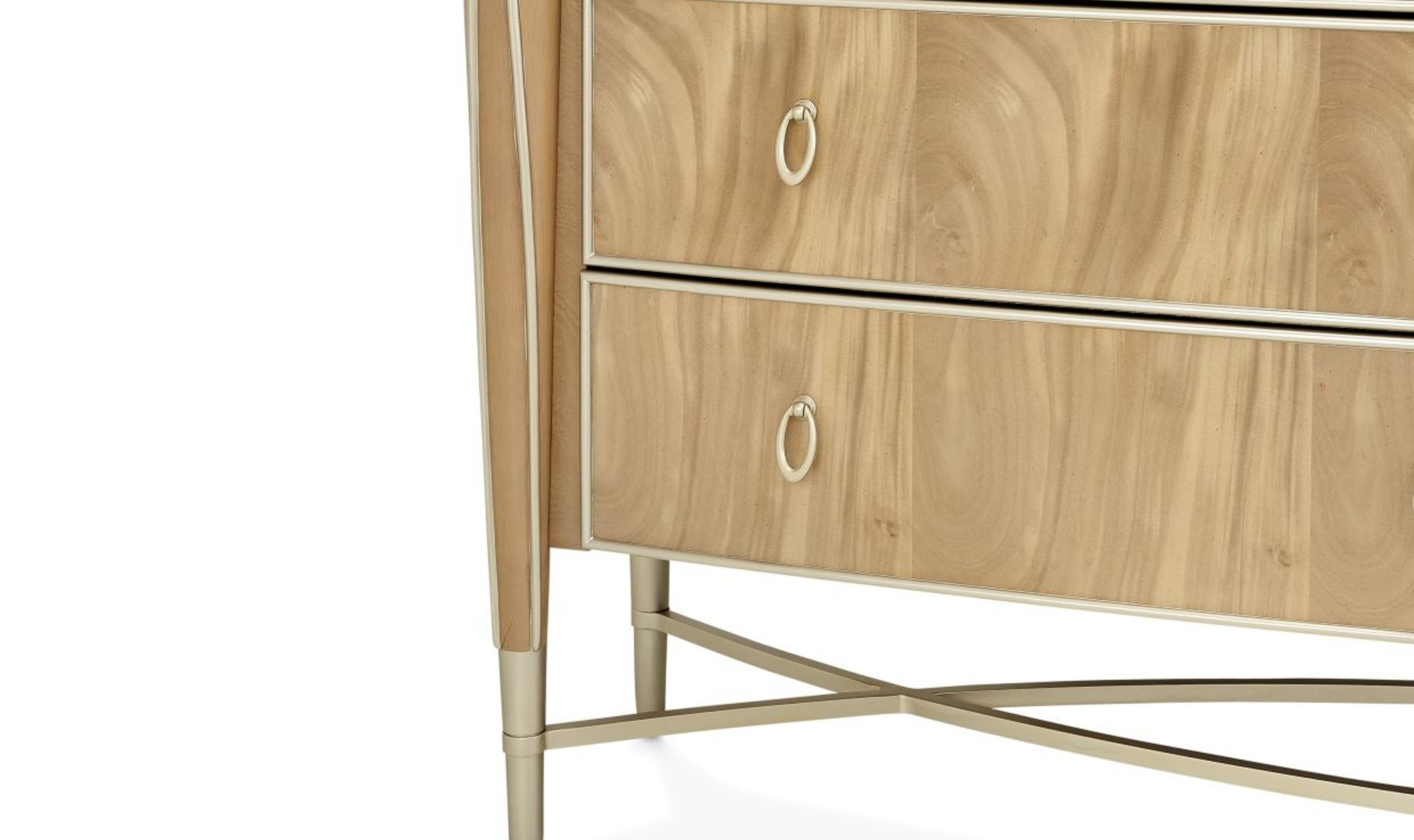 Design details extend to the dresser’s legs and hardware, which showcase a tapered profile and crossed rope motifs finished in Chardonnay, complemented by hoop drawer pulls and stretcher accents. Constructed from solid and manufactured wood, the dresser balances sturdy build quality with refined traditional aesthetics, reflecting the influence of world-inspired design elements that define AICO’s Villa Cherie collection. Its combination of functional features and classic style makes it suitable for both practical storage needs and aesthetic appeal.