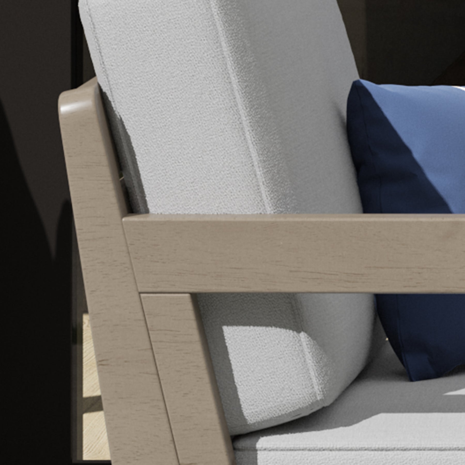 UV and water-resistant gray polyester cushions feature thick foam for cozy comfort and lasting performance.