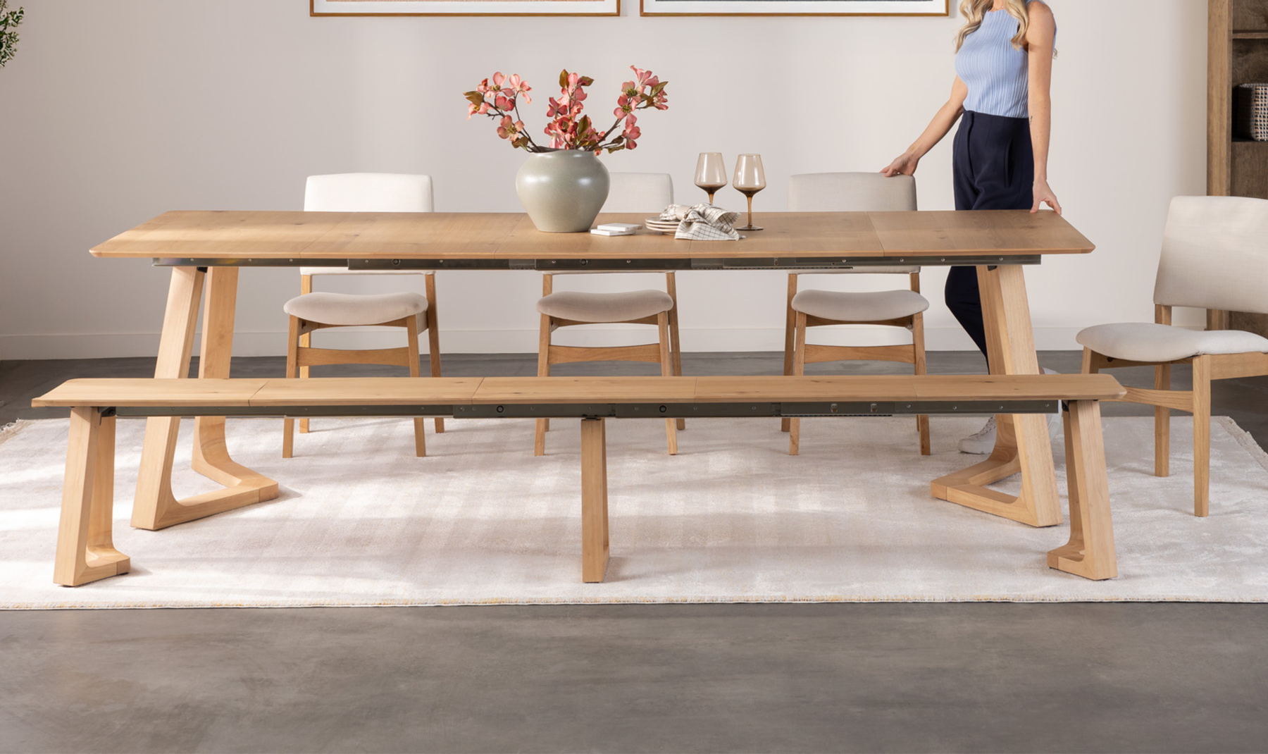 - Extendable dining bench with telescopic rail system