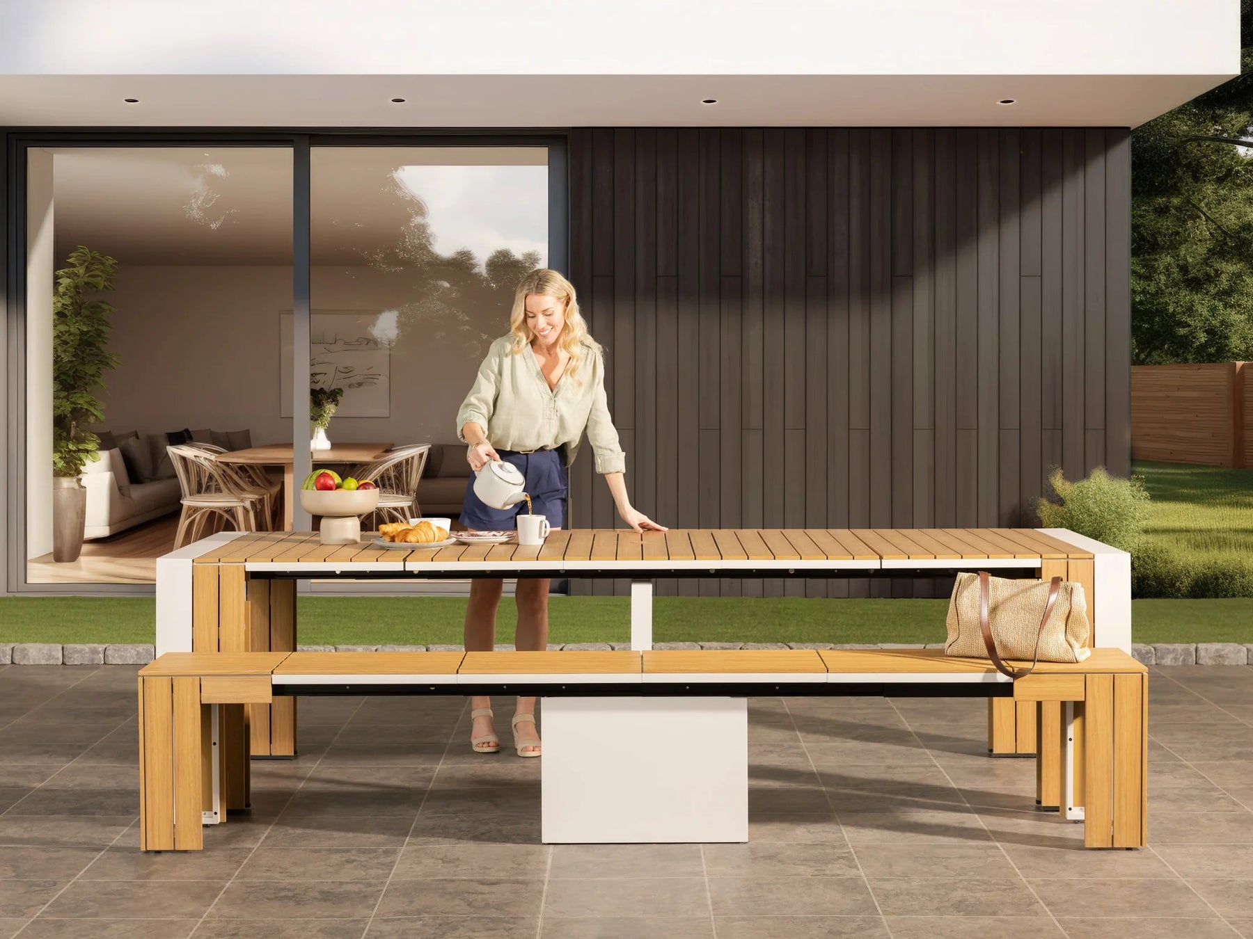 Available in two beautiful finishes — light oak and dark walnut — this outdoor wood bench can complement a wide range of outdoor decor styles. Whether paired with a modern outdoor dining table or used as a standalone seating option, the Transformer Outdoor Bench offers versatility and a refined look for any outdoor setting. Its space-saving, extendable design makes it the perfect addition to any patio, garden, or deck, providing both function and style for your outdoor living space.