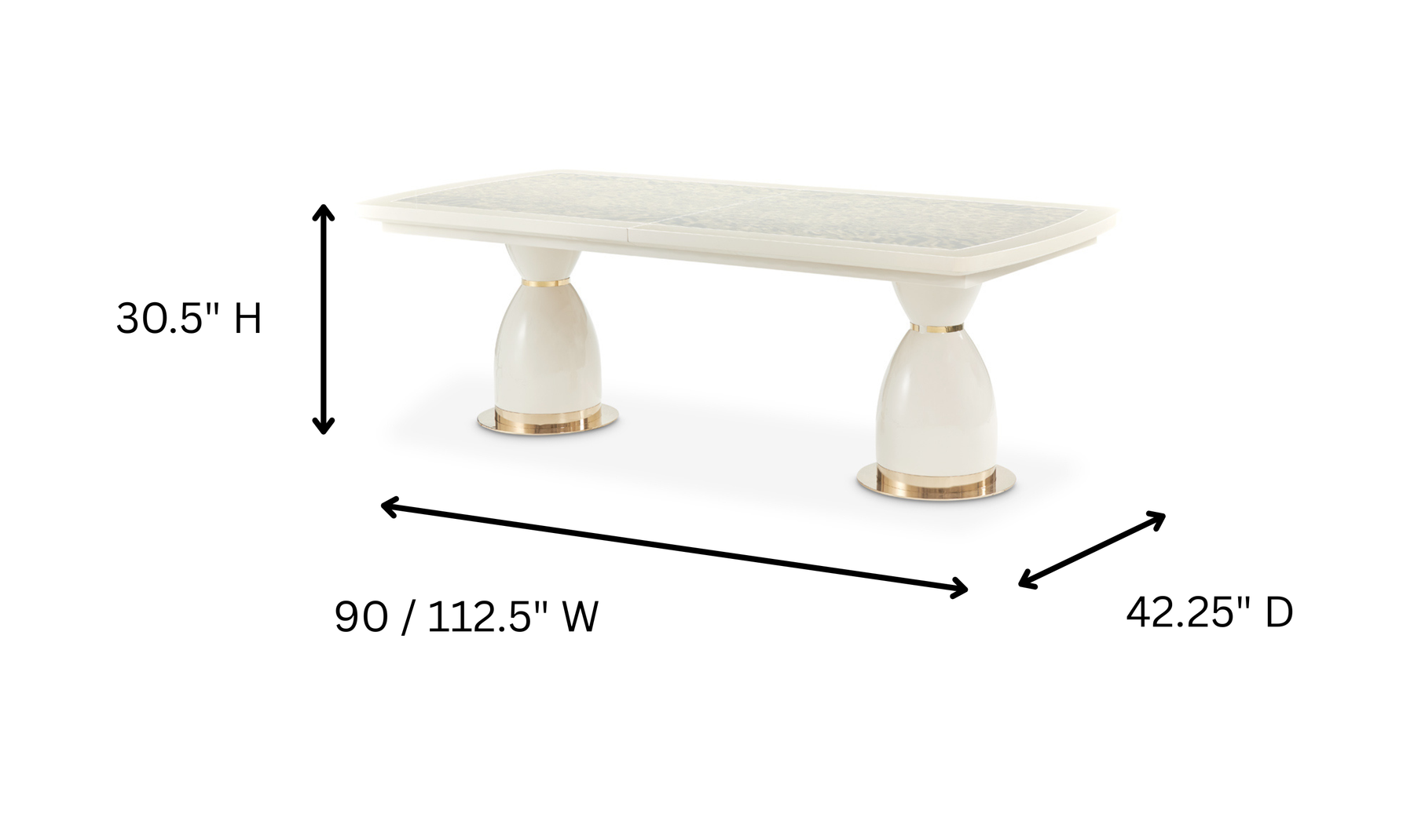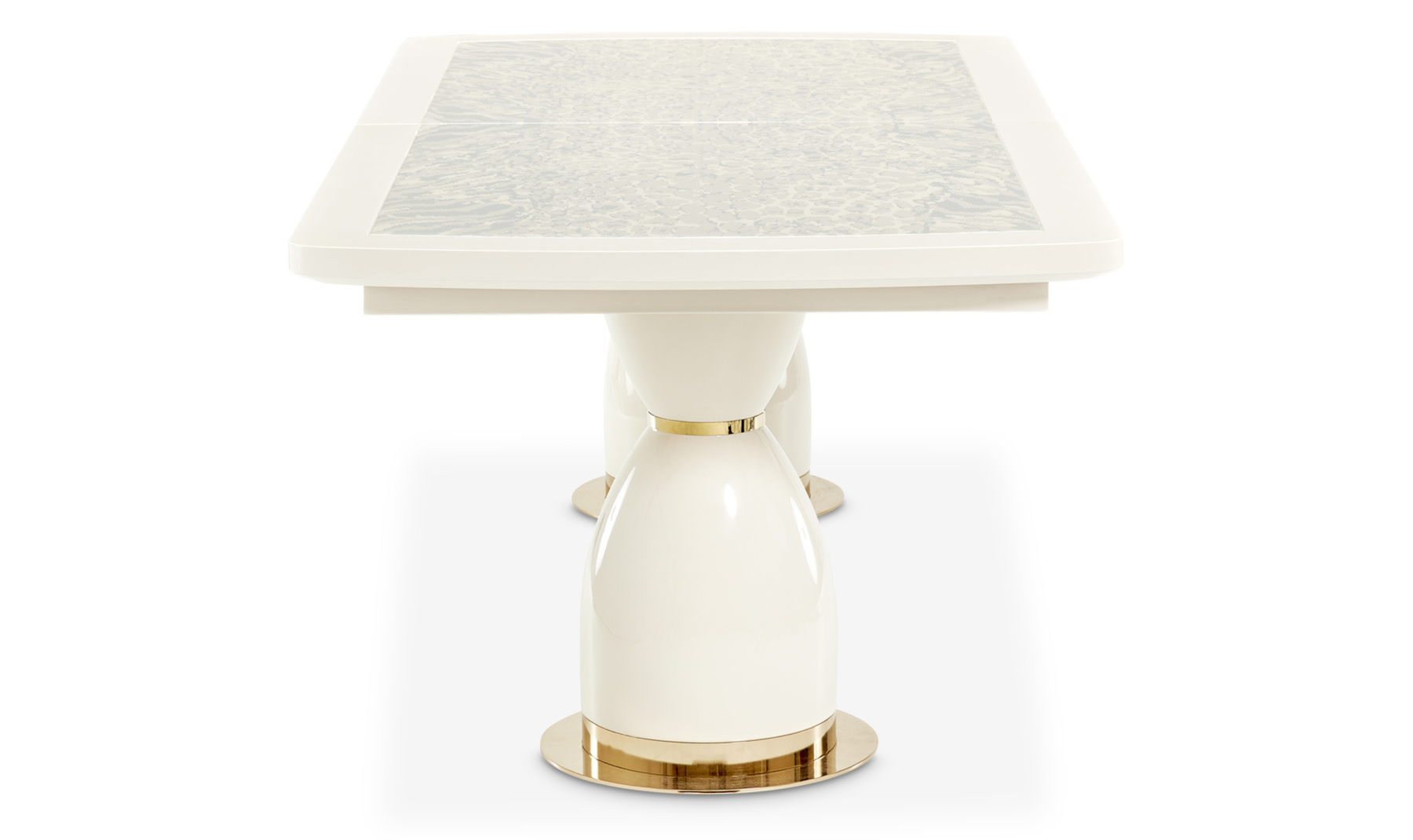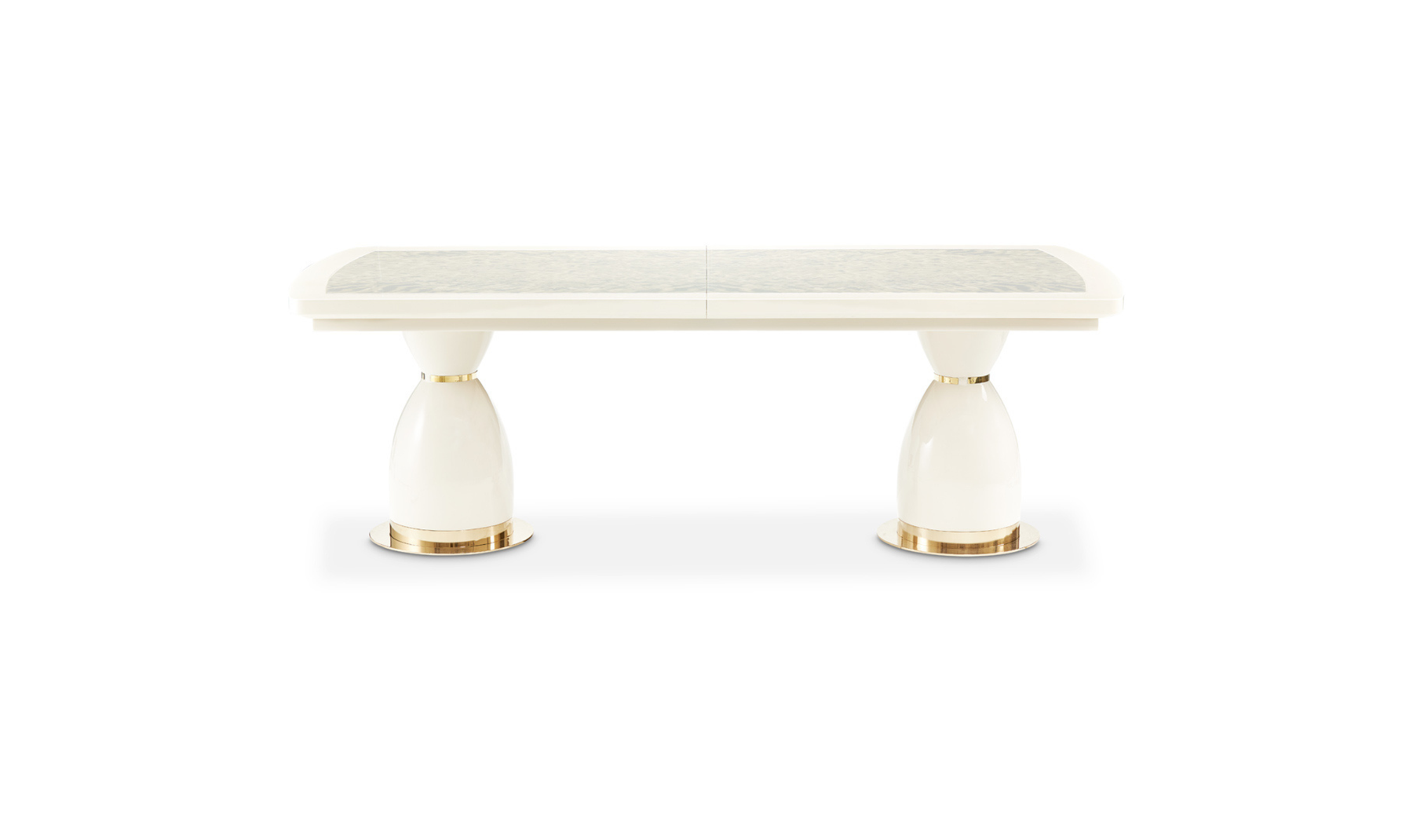 Supported by twin pedestal bases trimmed with brass-plated accents, the table anchors a room with quiet confidence. The included 22.5-inch extension leaf allows the piece to adjust effortlessly for larger gatherings. With its measured proportions and thoughtful detailing, the Lisbon Dining Table brings clarity and understated character to the dining environment.