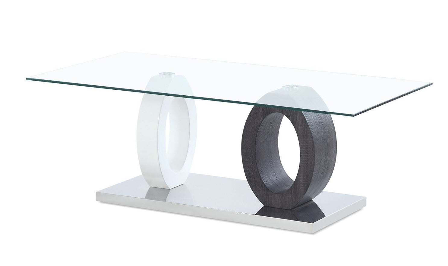 Unique design and modern appeal are the highlights of this dynamic and functional occasional table. From the gleaming Glass Top, to the sleek silver-toned base, this table will become the visual focal point in any room setting and will transform your seating/entertainment area from basic to wow! Striking two-toned dual oval base of grey and white make this table easy to coordinate décor and provides many decorating possibilities. The lovely Glass Top is generously proportioned, making this table great for entertaining or display. Quality craftsmanship in all facets of production ensures durability and long-lasting wear. Inspired design elements and versatile function make this table a must have piece for your home and will provide you with years of enjoyment and usefulness.