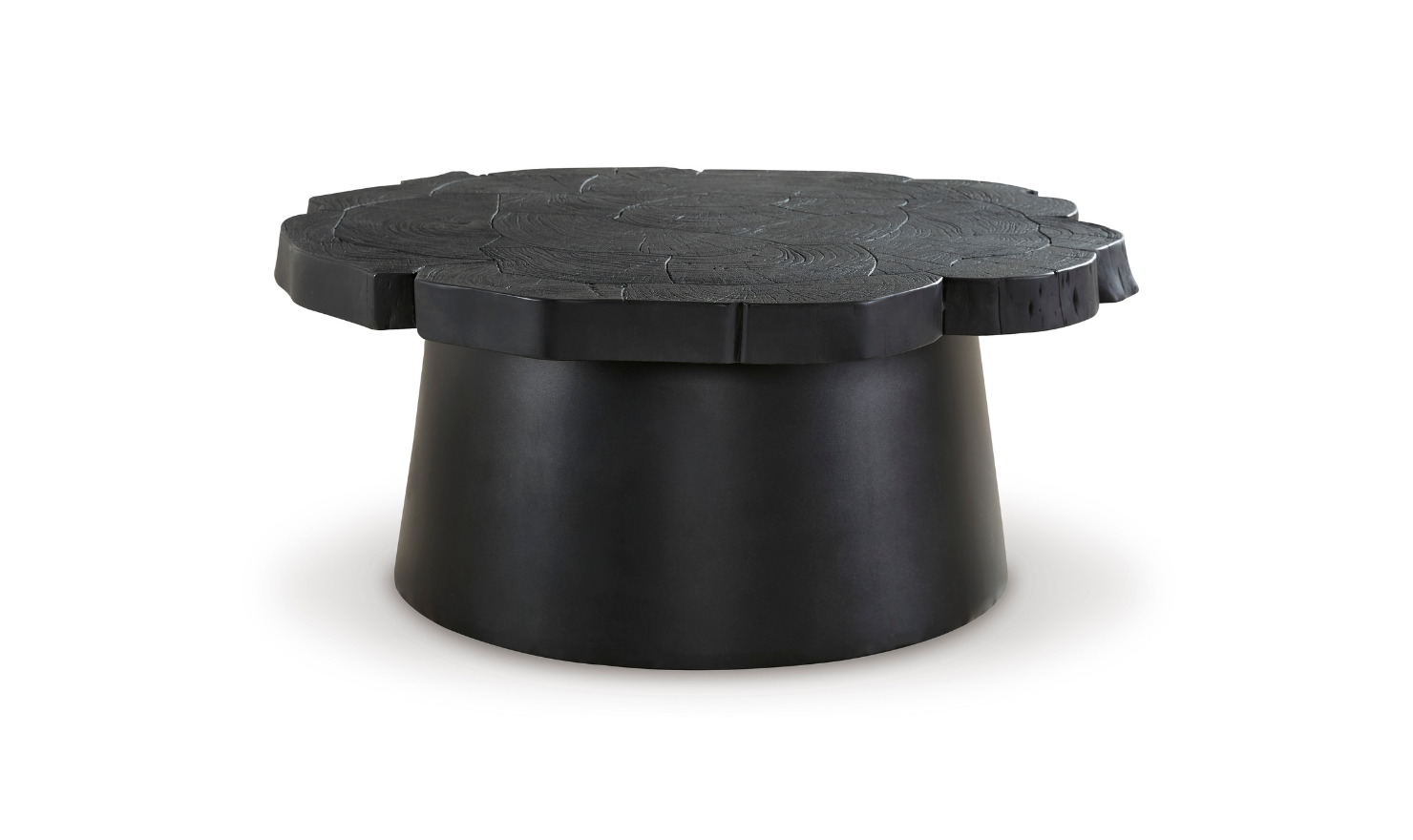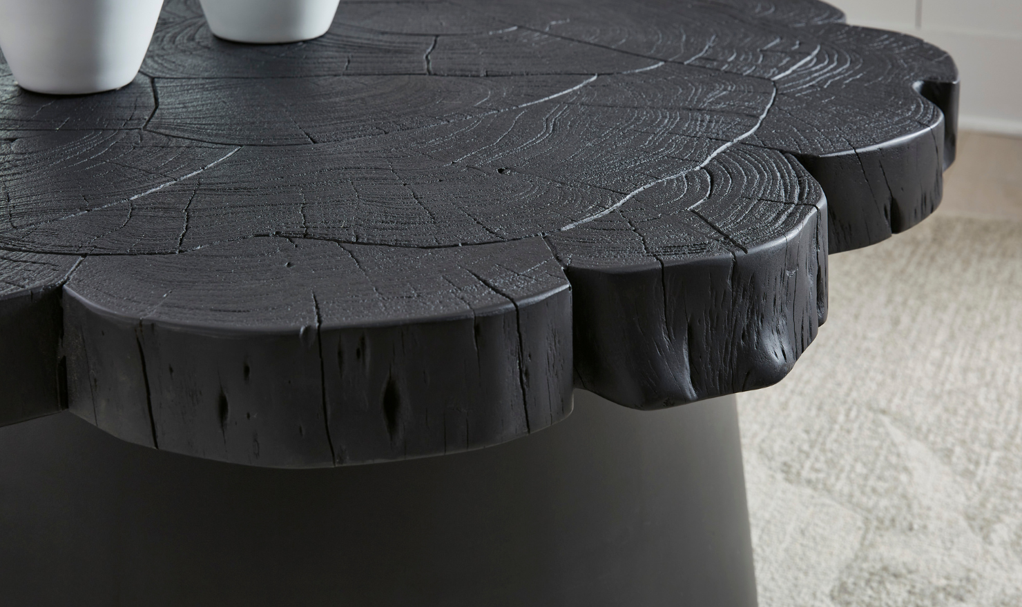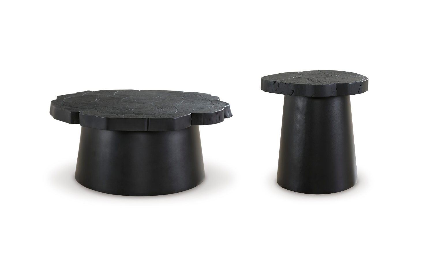 The Modern Heritage Wimbell Occasional Table Set blends natural craftsmanship with a clean, contemporary silhouette. Each table is crafted from solid acacia wood, offering a sturdy surface with a live edge and grooved detailing that gives the set a distinct, textured character. The round tabletops are finished in black, highlighting the organic shape of the wood while maintaining a minimalist aesthetic that suits both casual and modern living spaces.