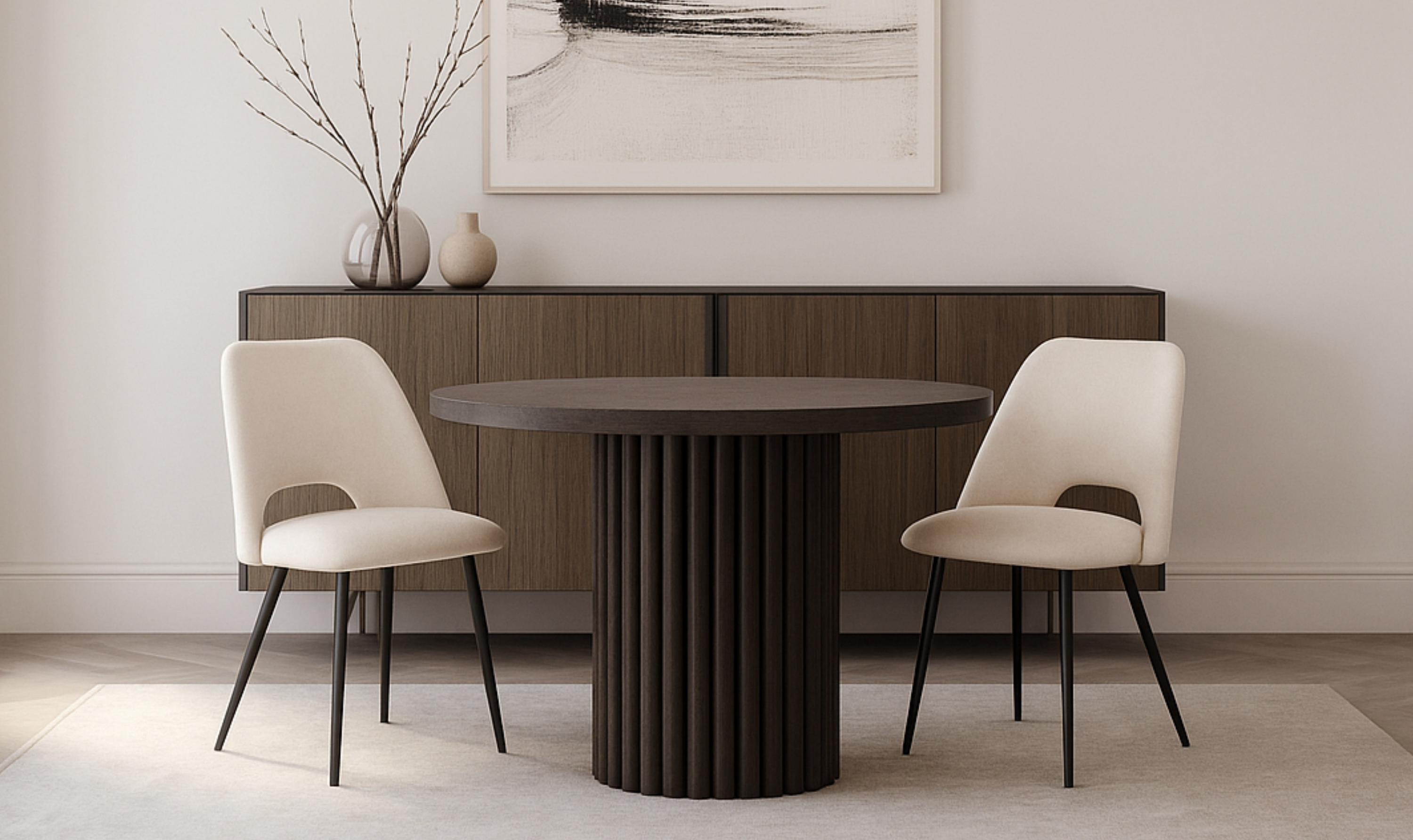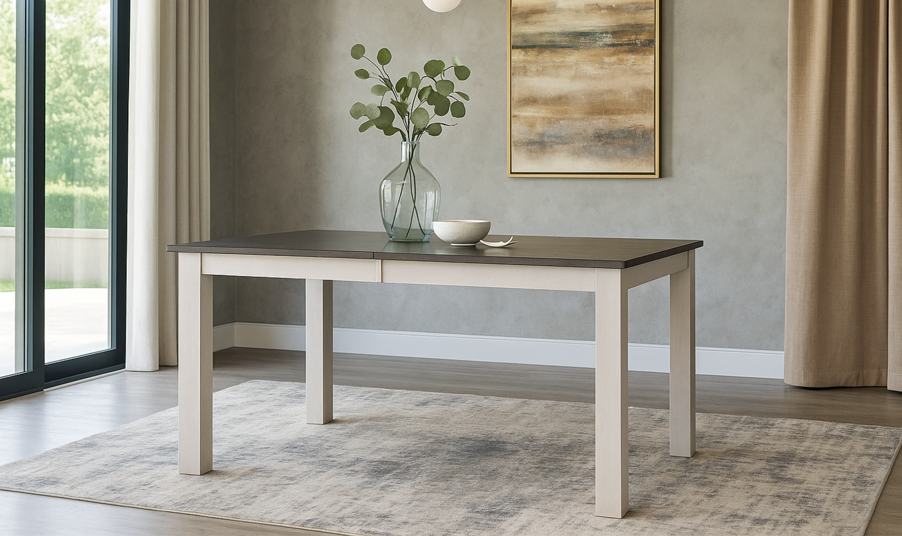 The Iconic Furniture Deco Antiqued Grey Stone Black Stone 5-Piece Dining Set offers a functional yet refined addition to any dining space. The round pedestal table features a gear-driven 18" leaf that smoothly extends the table from 45" to 63" in length, providing extra space when needed. Its two-tone antiqued grey and black stone finish creates a balanced look that pairs well with both traditional and modern interiors. The deco-style pedestal base adds a subtle visual statement without overwhelming the design.