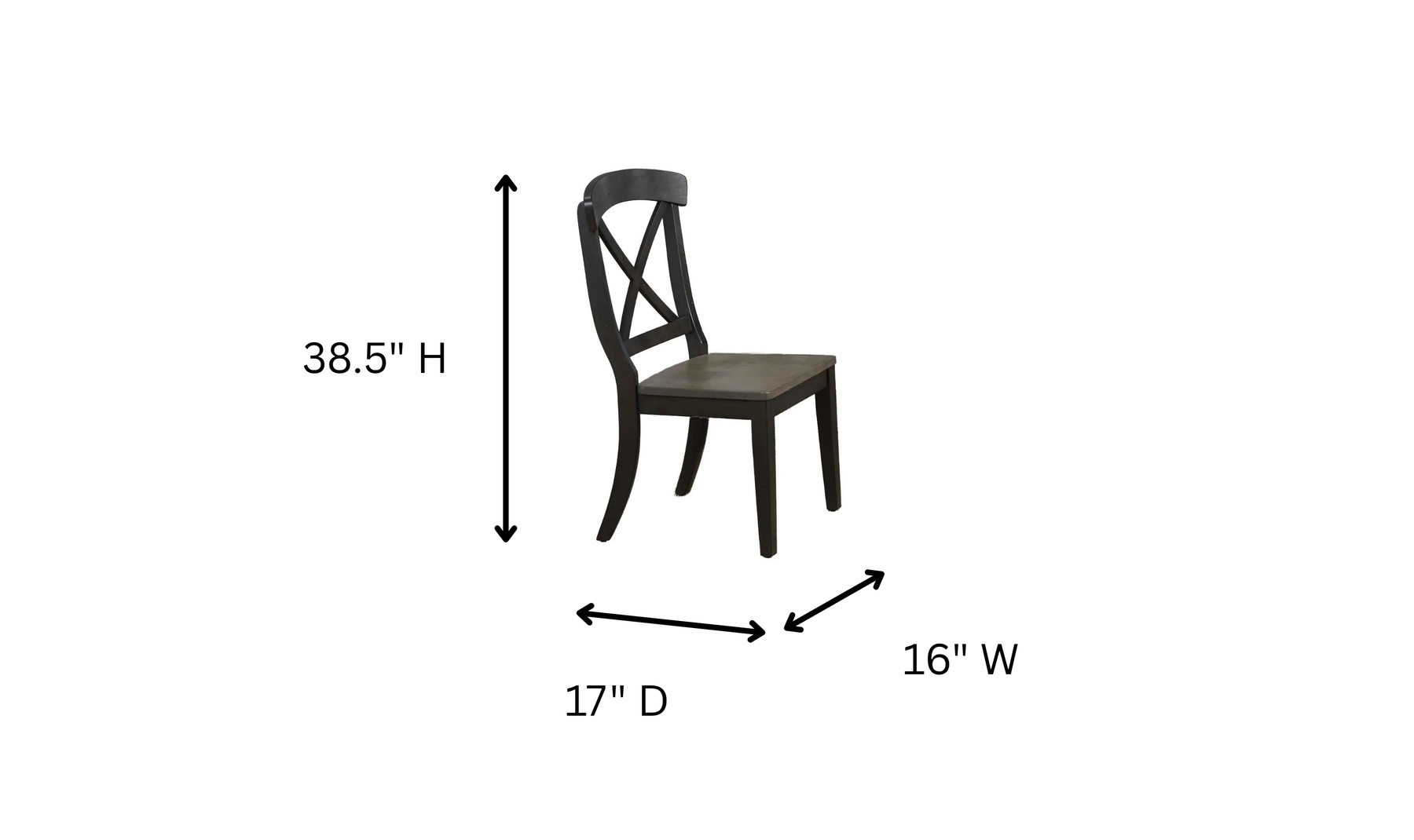 The accompanying X-back side chairs carry the same dual-tone finish and lightly distressed look, tying the set together with subtle consistency. The chair's transitional silhouette is complemented by a wood seat and slightly tapered legs that provide comfort and stability without unnecessary bulk. Each set of two chairs comes ready to complement the table’s style while offering practical functionality in everyday use. Together, this set delivers a grounded, lived-in look ideal for both casual and semi-formal dining spaces.