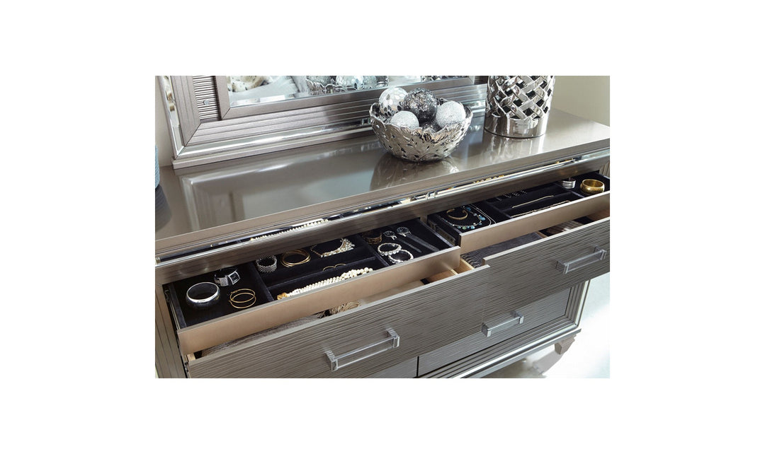 Designed to help your bedroom reach its full glamorous potential, the Tamsin Collection’s unique attributes blend to create a stylish and functional addition to your lifestyle. Mirrored framing provides a dramatic enhancement to the dresser, illuminating the silver-gray finish. Acrylic hardware provides an unobtrusive decorative touch to the drawer fronts of the dresser. Hidden jewelry drawers in the dresser create discrete storage space for your fancy accouterments.