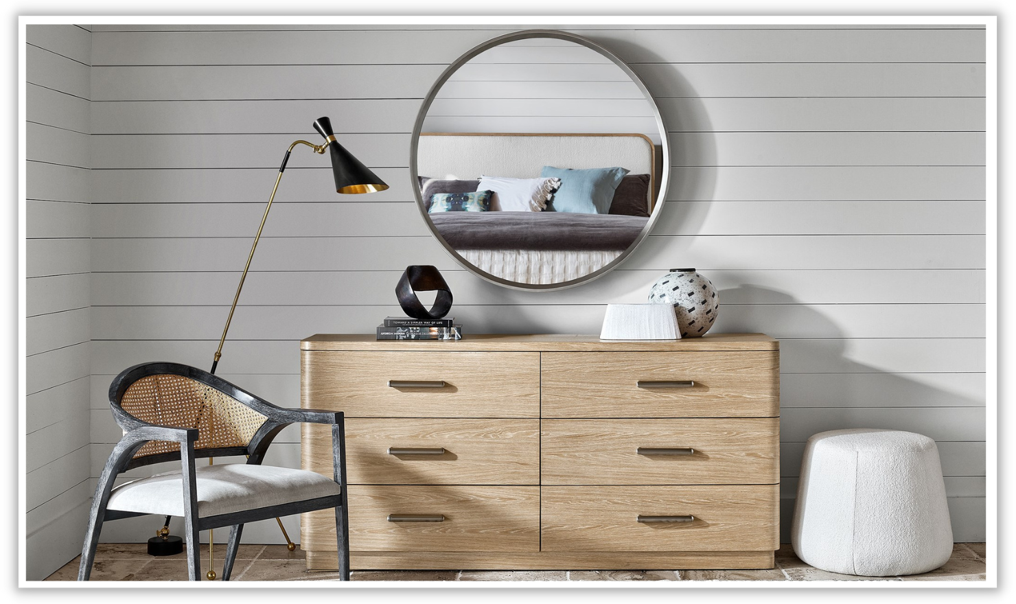 Inside, practical details add to the dresser’s usability. A removable gray felt-lined jewelry tray in each of the top drawers offers protected storage for smaller items, while the bottom drawers are cedar-lined to naturally preserve linens or seasonal clothing. Soft-close undermount guides ensure drawers glide smoothly and quietly. Adjustable levelers and a safety tip kit complete the piece, making it suitable for a variety of home setups without compromising on safety or style.