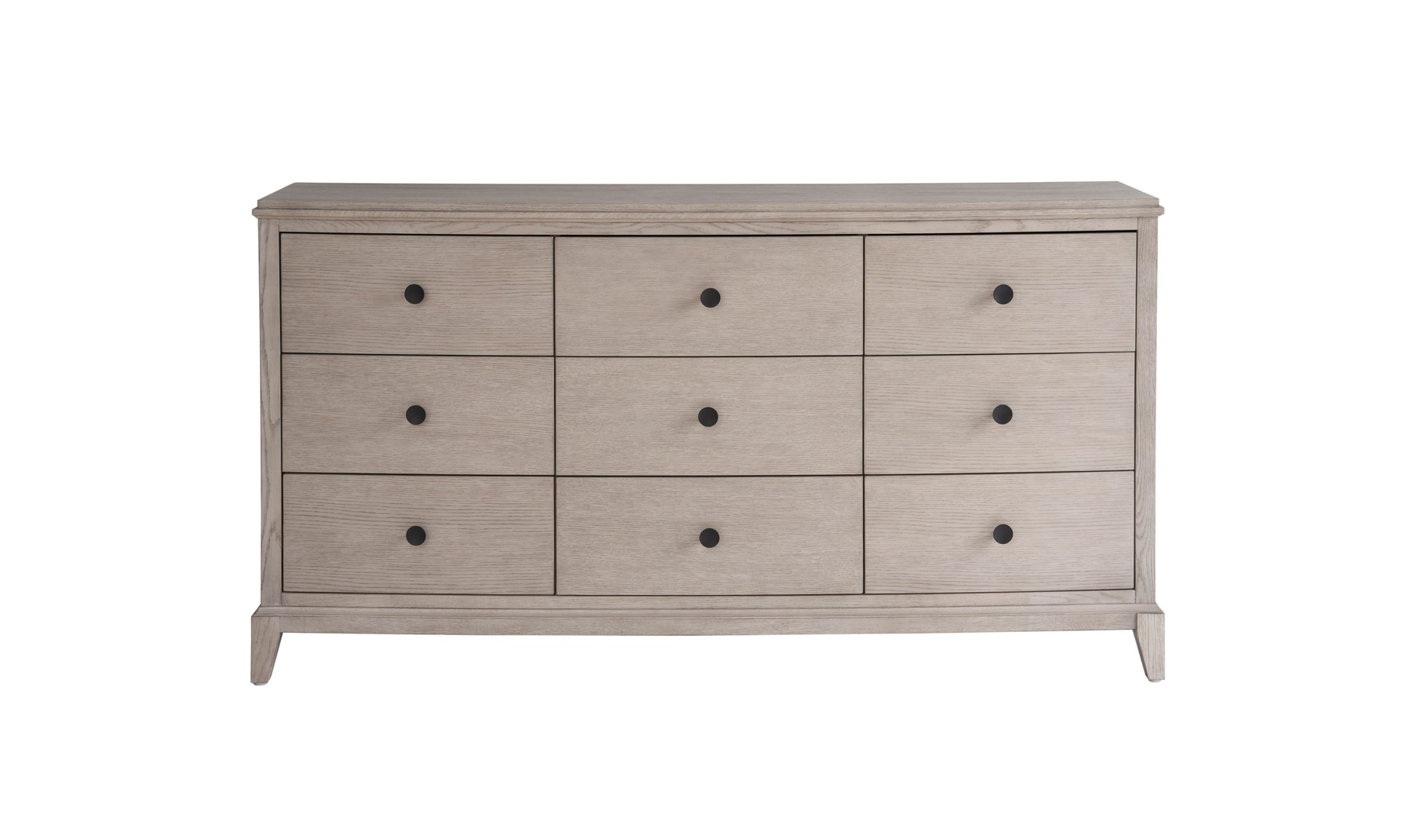 The Coalesce Wooden Light Gray Dresser by Universal Furniture brings a thoughtful balance of form and function to the bedroom. Its light gray "Rolling Fog" finish gives the solid silhouette a clean, understated presence, while nine spacious drawers provide ample storage for everyday clothing and accessories. Subtle, rounded metal pulls lend a quiet sophistication, complementing the minimalist lines of the dresser without drawing attention away from the piece as a whole.