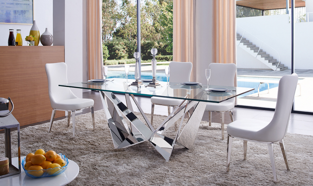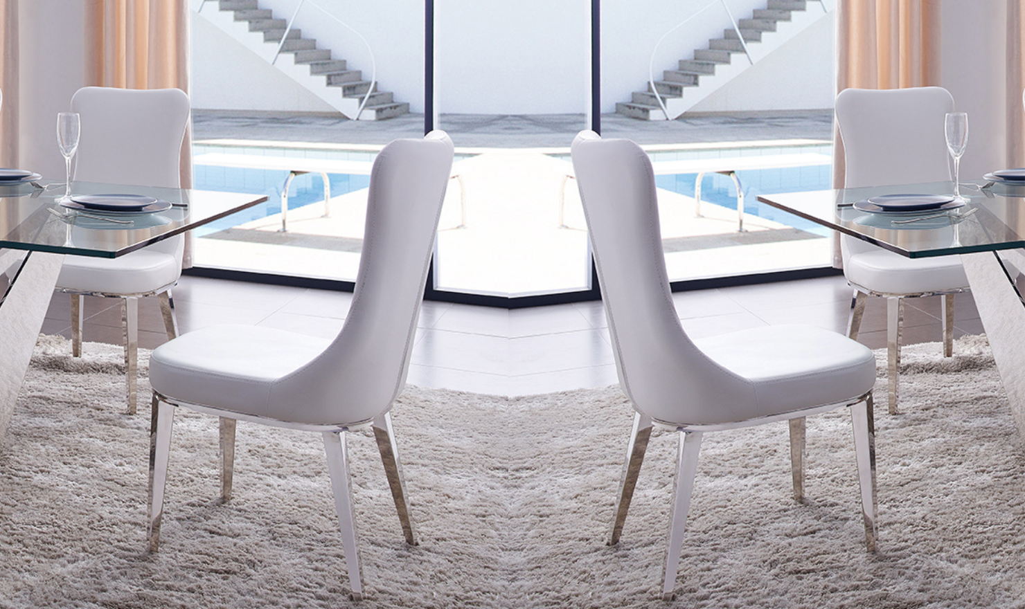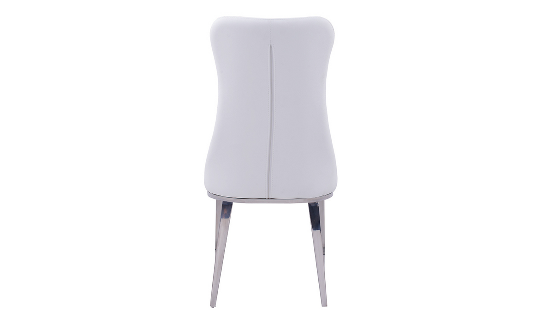 This modern dining chair brings a sleek and minimalistic design to any dining room. Upholstered in smooth eco-leather with a solid white finish, the chair's contoured backrest ensures comfort while complementing the room's aesthetic. Its slim metal legs provide stability and support without being overly bulky, making it a versatile addition to any modern or contemporary dining setup.