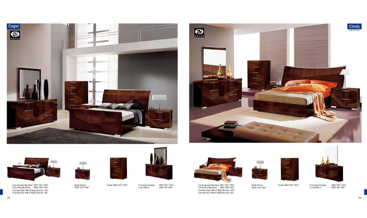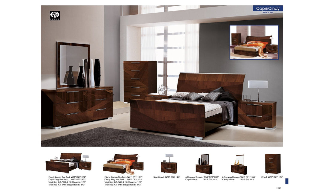 _ Prestige Deluxe Bedroom completes the Day collection with essential items to furnish your home with exclusive style. Bed; elegant and sober; is also available with upholstered headboard for a more sophisticated taste. Chromed details enrich collection with a touch of impeccable charm and artistic distinctiveness. The Bedroom Set with Sleigh Bed consists of Queen Size Bed; Nightstand; Dresser and Mirror. The Bed is available in Queen and King Sizes. The 5-Drawer Chest is an optional items.Straight panels are in chipboard; then veneered (veneer being a thin layer of solid wood); then the veneers are lacquered using a 6 steps/layers of UV high gloss polyester lacquer. Manufactured according to European and international standards.