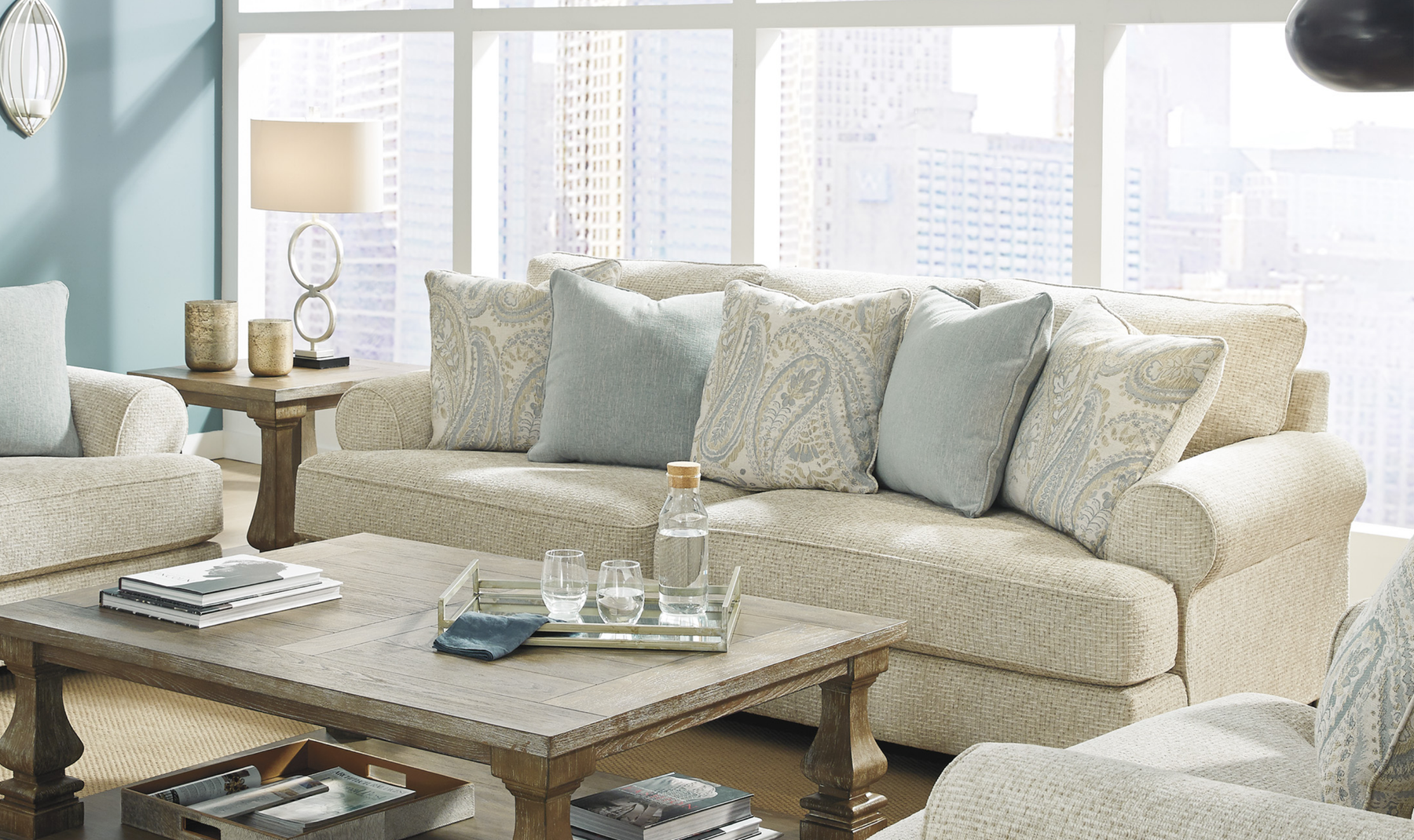 Draped in a soft, textured chenille polyester upholstery, the Monaghan invites you to sink into its plush, reversible cushions and enjoy unparalleled coziness. It comes complete with five coordinating toss pillows in spa mist and elegant jacquard paisley patterns, adding just the right touch of luxury and layered visual interest.