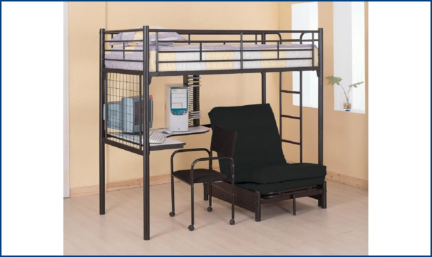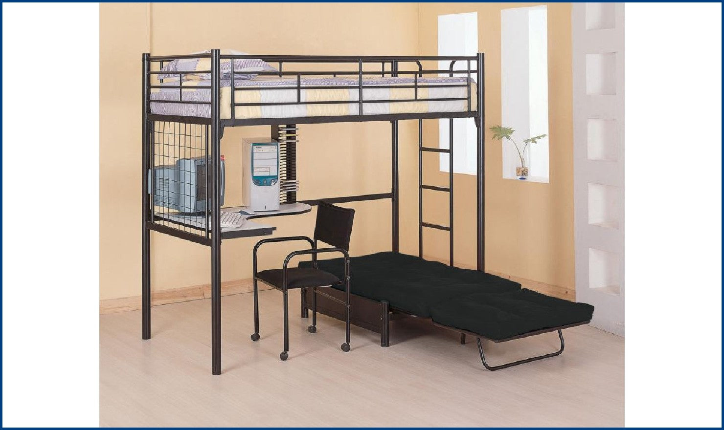 • Twin workstation loft bed finished in glossy blackwith desk top finished in white• Constructed with steel, MDF, and engineered veneer• Full length guardrails• Workstation includes built-in CD rack• Chair and multi-functional futon frame included• Pad #2335M & mattress sold separately• Slat kit includedDIMENSIONS