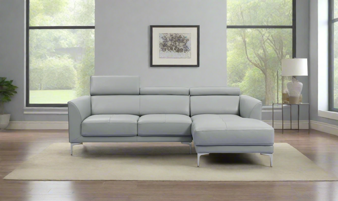 Experience the perfect blend of modern design and everyday comfort with the Gio Italia Slate Gray Leather L-Shape Sectional Sofa. Upholstered in luxurious top-grain leather with a subtle slate gray hue, this sectional offers a sleek, contemporary look that effortlessly complements both neutral tones and bold accents. Its L-shaped configuration provides ample seating for family or guests while maintaining a streamlined, space-efficient profile.