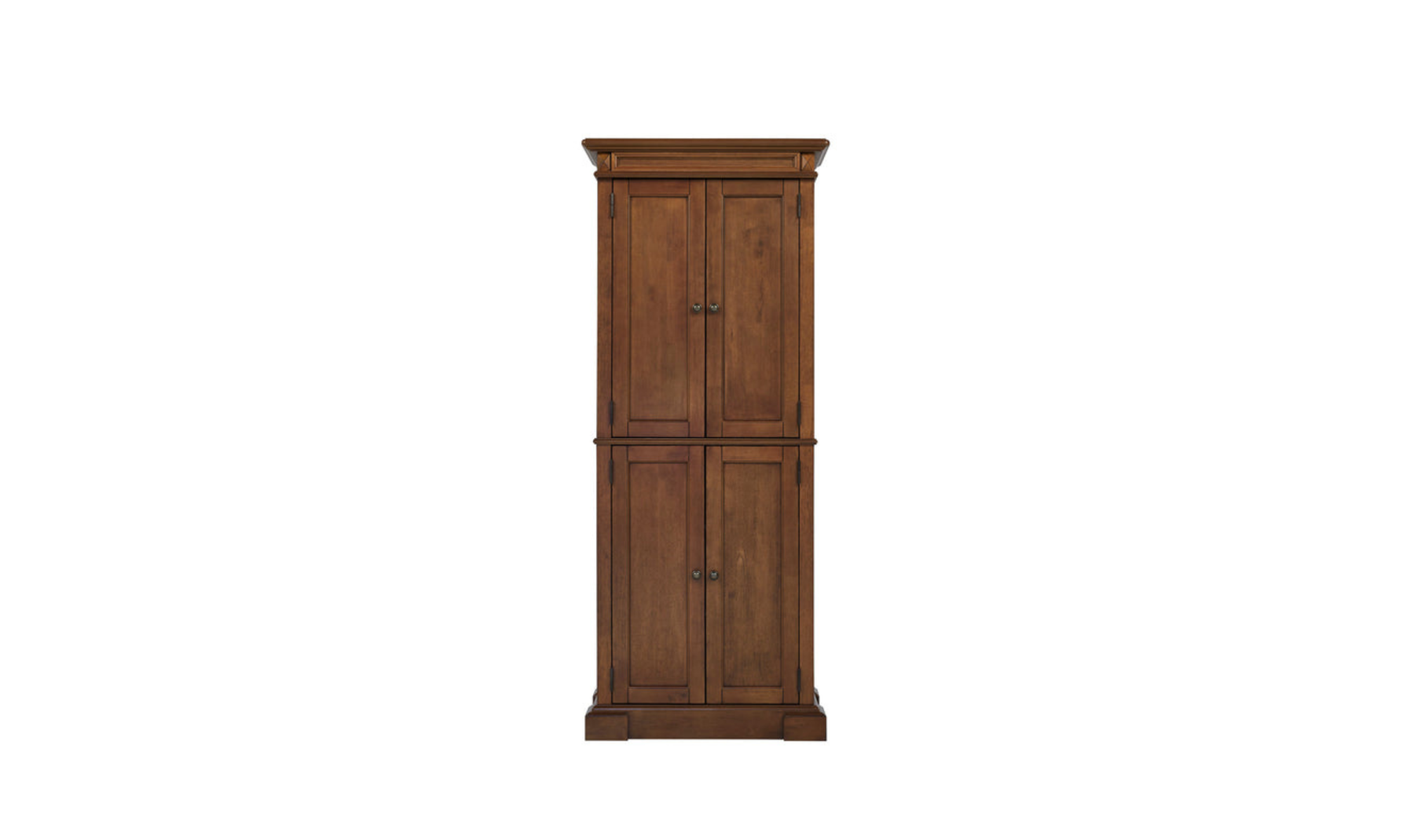 The Homestyles Americana Pantry combines traditional craftsmanship with functional design to enhance your kitchen or storage area. Built from solid hardwood with a distressed oak finish, it features carved door panels and diamond-shaped accents that lend a classic craftsman appeal. Antique nickel hardware completes the look, adding subtle contrast and timeless charm.