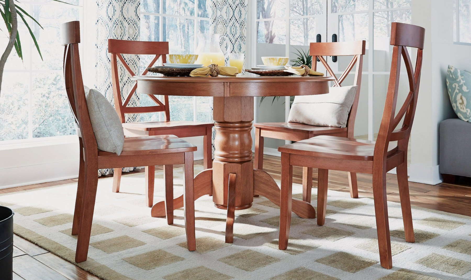 This charming Conway 5-Piece Dining Set by homestyles will easily expand your options when it comes to a gathering place for meals, games, and other activities. Features a solid hardwood construction and a cottage oak finish with protective clear coat. The chairs are solid hardwood with a subtle mission style appeal. Comes carefully packaged with all items labeled and coordinating easy-to-follow assembly directions. Table measures 30"H x 42"W x 42"D. Chairs measure 38.5"H x 19.25"W x 22.5"D. Seat is 17.75"w x 17.25"D.
