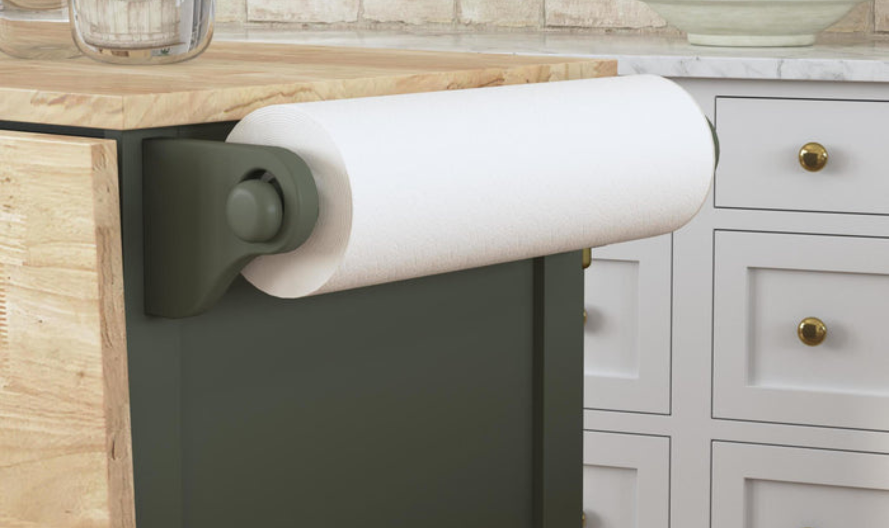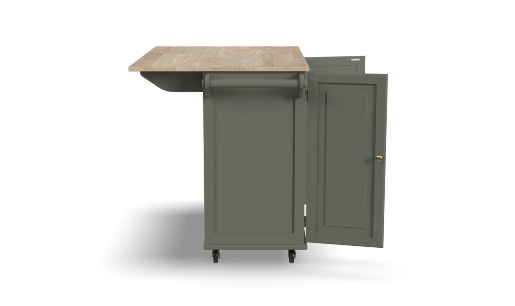 The Dolly Madison Drop Leaf Kitchen Cart by Homestyles combines practical storage with traditional design. Built from a mix of solid and engineered wood, it features a natural hardwood top paired with a sage green painted frame. The cart includes three drawers and two adjustable shelves, providing ample storage for utensils, cookware, and kitchen essentials. Its brushed brass hardware adds a subtle contrast, enhancing its warm and timeless look.
