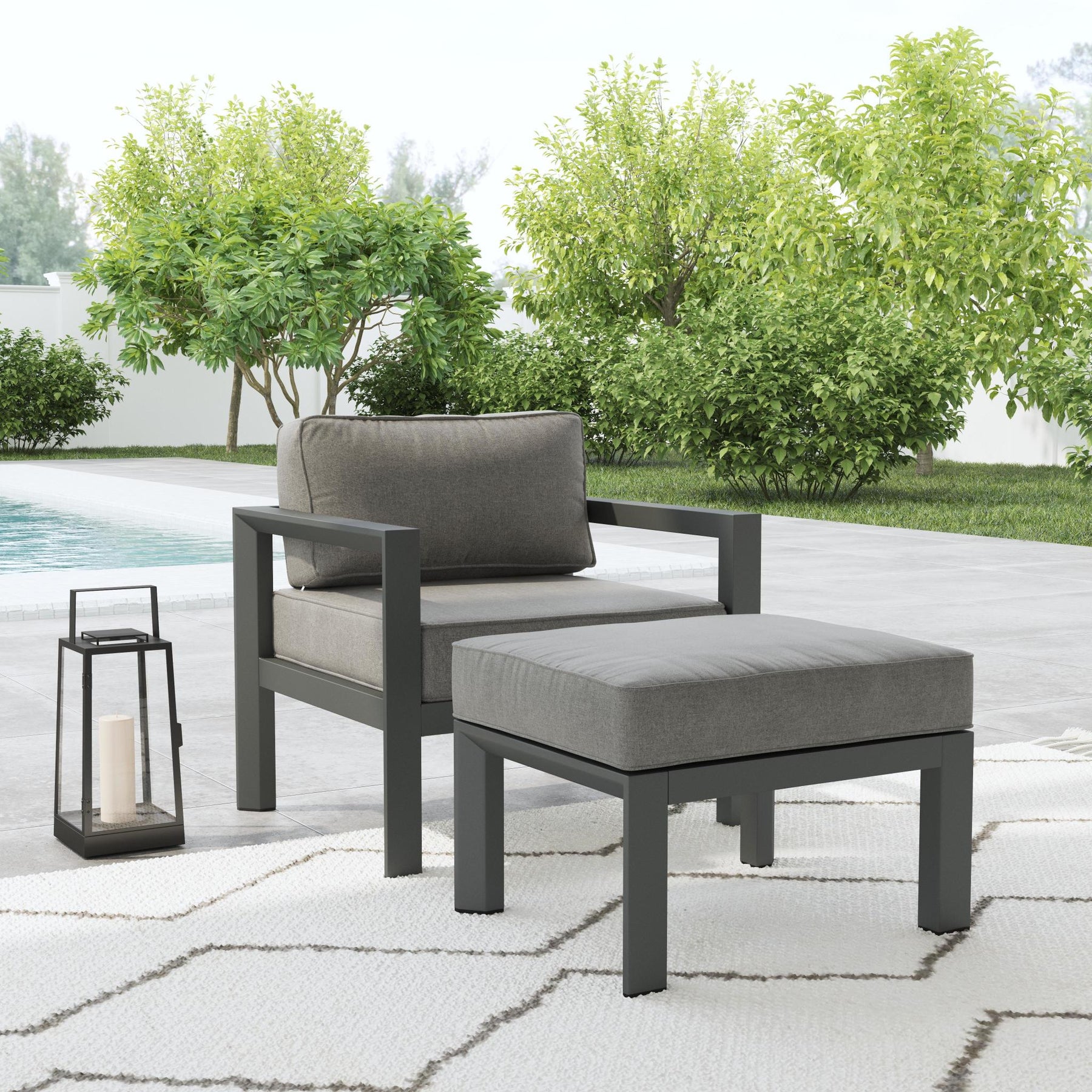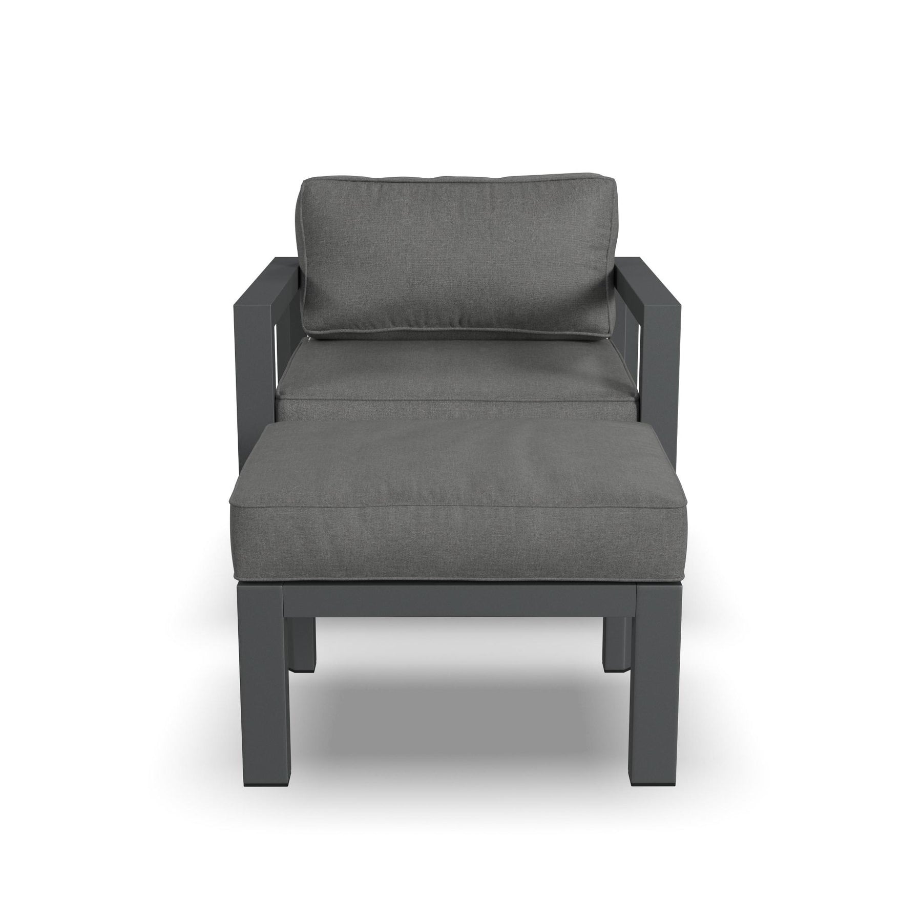 Outdoor spaces become as comfy and cozy as a living room when you add a Homestyles Grayton Outdoor Chair with Ottoman. With thick seat and back cushions that you can sink into, your favorite chair in the house might just be found outdoors. And kick your feet up on the matching ottoman. The recycled aluminum frame with stainless steel hardware and weather-resistant cushions make this a chair for all seasons, year after year.