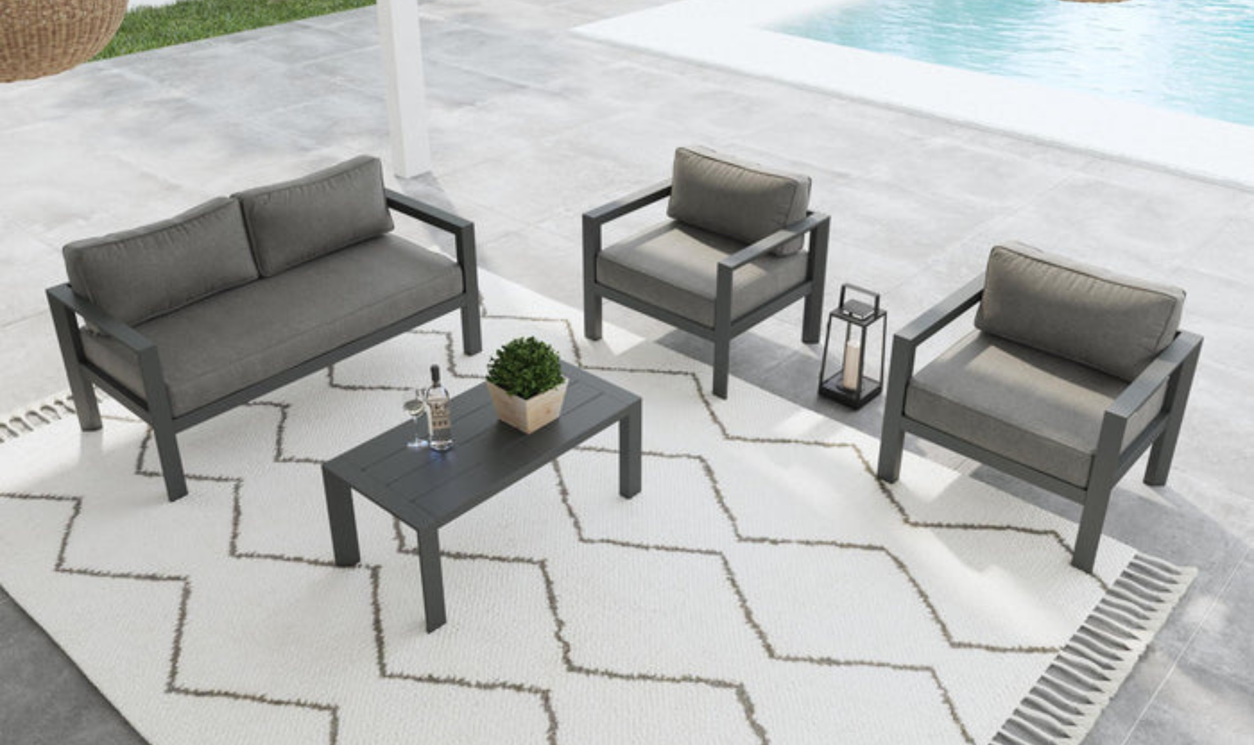 The Homestyles Grayton Outdoor 4-Piece Set brings indoor comfort outdoors with a design that balances durability and simplicity. Crafted from recycled aluminum, the loveseat, two lounge chairs, and matching coffee table are built to withstand the elements while maintaining a lightweight and rustproof structure. The minimalist frame complements the soft gray cushions, creating a setting suited for both relaxed evenings and casual gatherings.