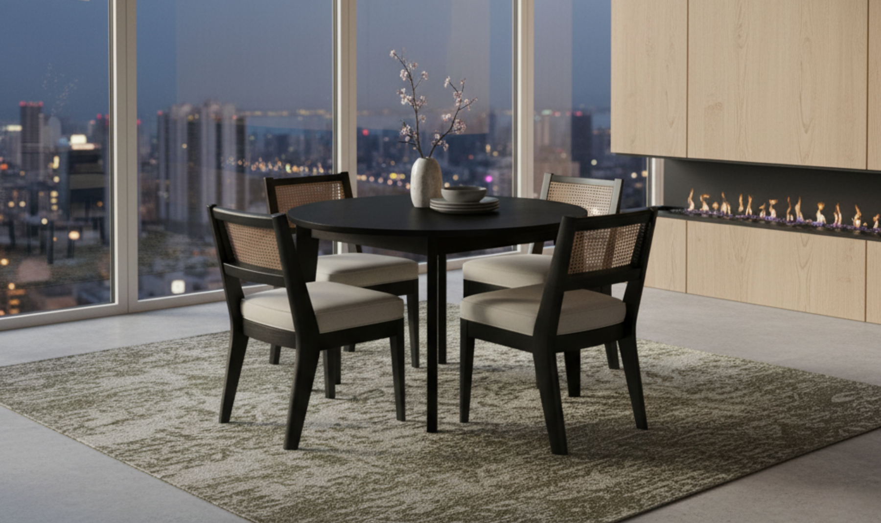 Each piece is thoughtfully crafted from sustainably sourced wood and oak veneers, ensuring strength and a consistent finish that lasts through everyday use. The chairs feature natural cane backs that add texture and an airy feel, paired with removable seat cushions upholstered in a durable, easy-to-clean performance fabric. Whether you’re hosting dinner or enjoying a quiet morning coffee, this dining set combines comfort, quality, and understated style that fits effortlessly into any home.