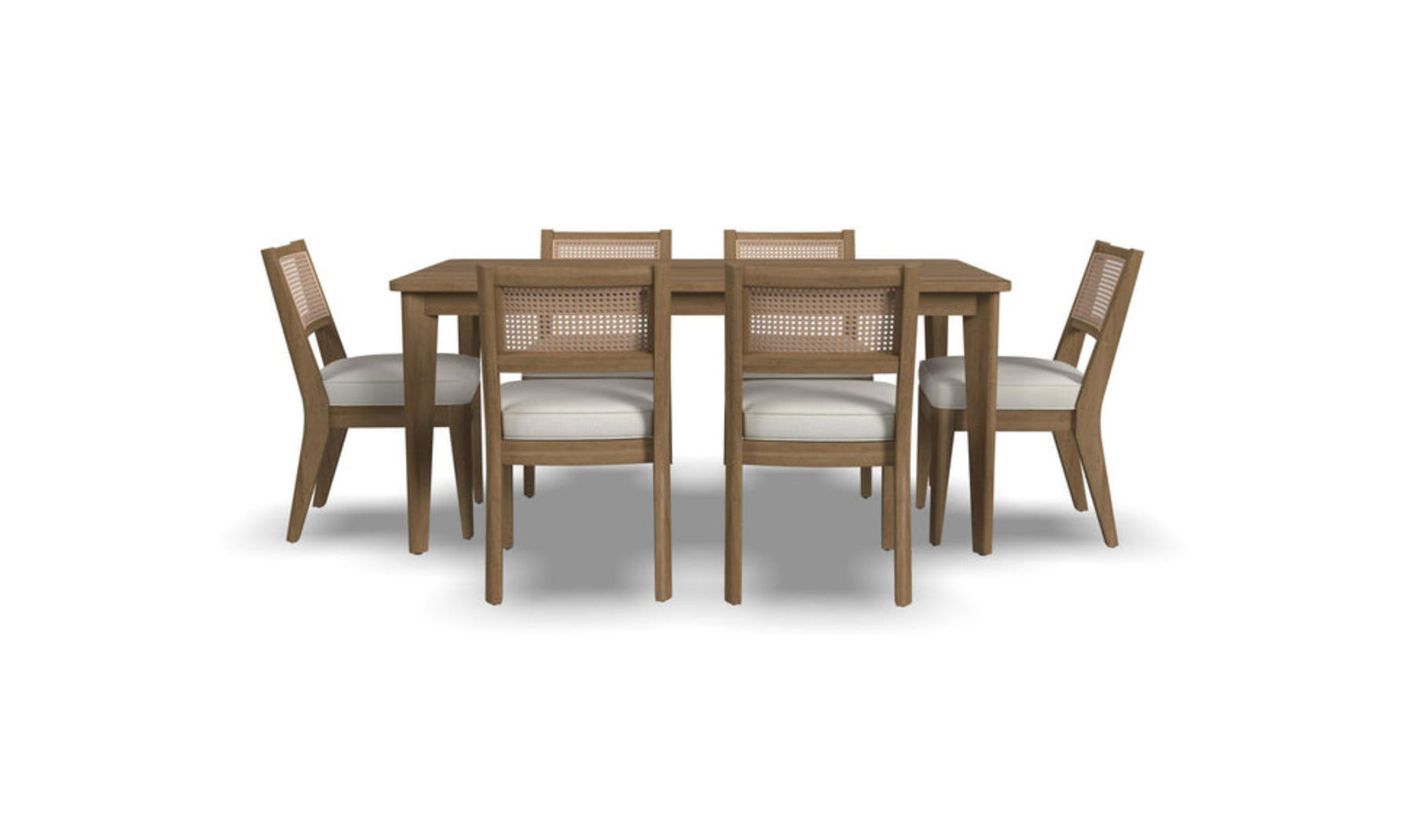 Each of the six chairs features a handwoven cane back that introduces a touch of natural texture and craftsmanship. The removable cushions are upholstered in a durable performance fabric that resists everyday wear while remaining easy to clean. Crafted from sustainably harvested wood and oak veneers, the Brentwood Dining Set is built to last, offering both comfort and reliability in a timeless design that feels right at home in small or spacious dining areas alike.