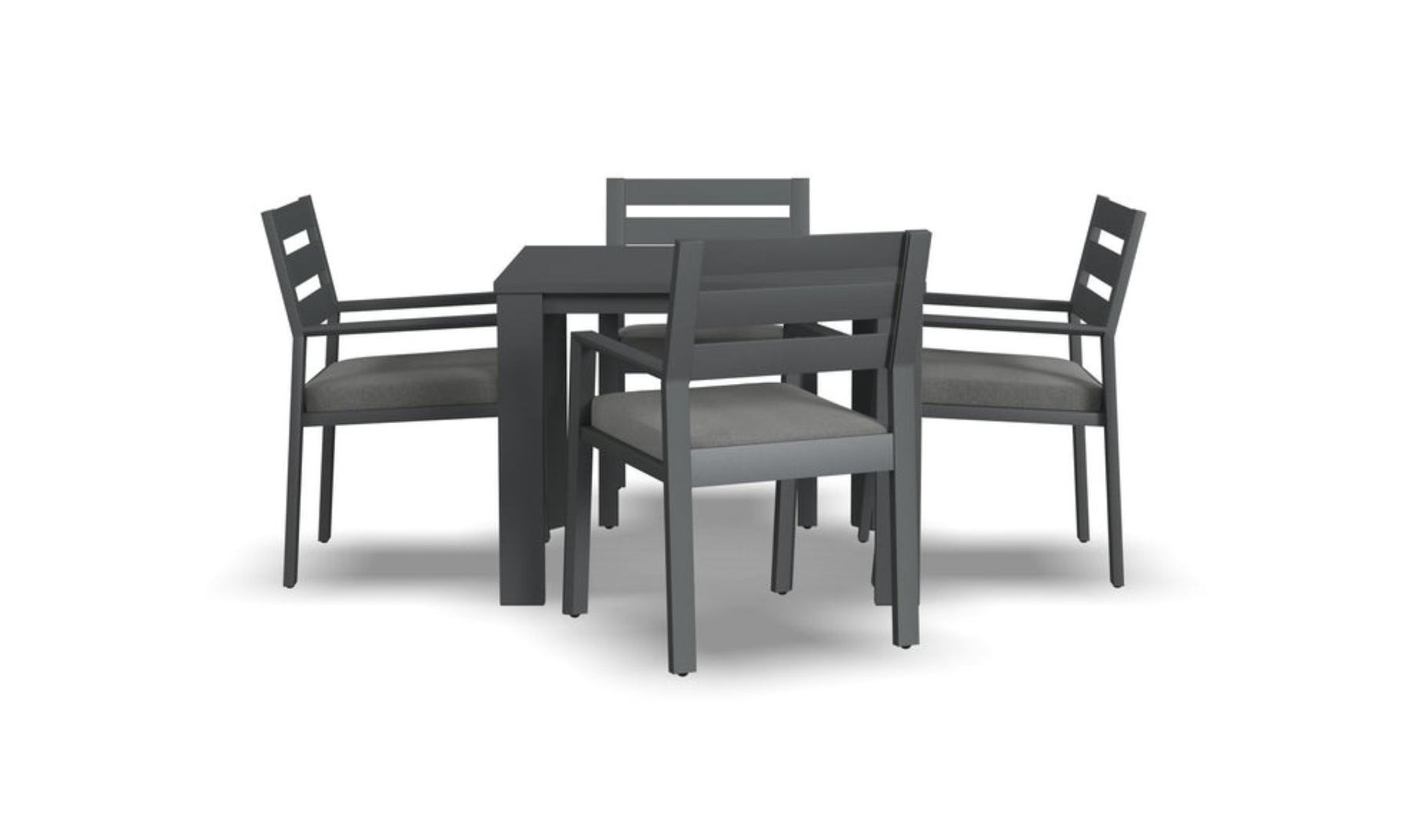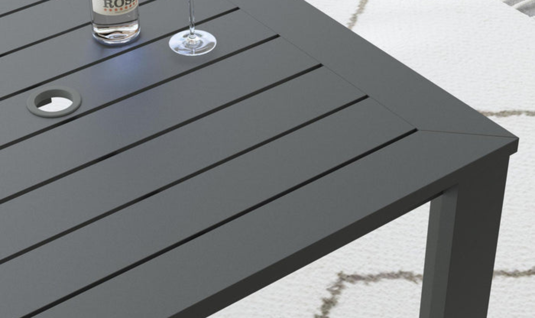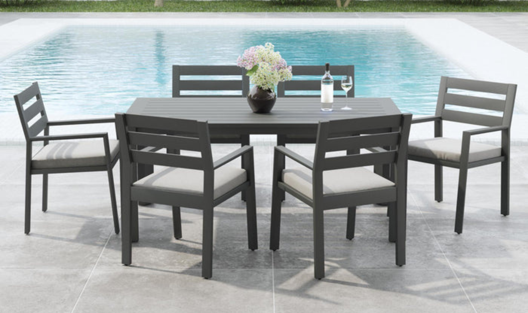 The Homestyles Grayton Outdoor Dining Set brings relaxed, everyday dining to any patio, deck, or garden. Available in both 7-piece (one table and six chairs) and 5-piece (one table and four chairs) options, this set is built for gatherings large or small. The rectangular table features a practical slatted top that prevents water from collecting, while a central hole allows for a 2” outdoor umbrella to provide shade on sunny days. Each piece is made from rustproof recycled aluminum, ensuring a lightweight yet durable frame that stands up to the elements season after season.