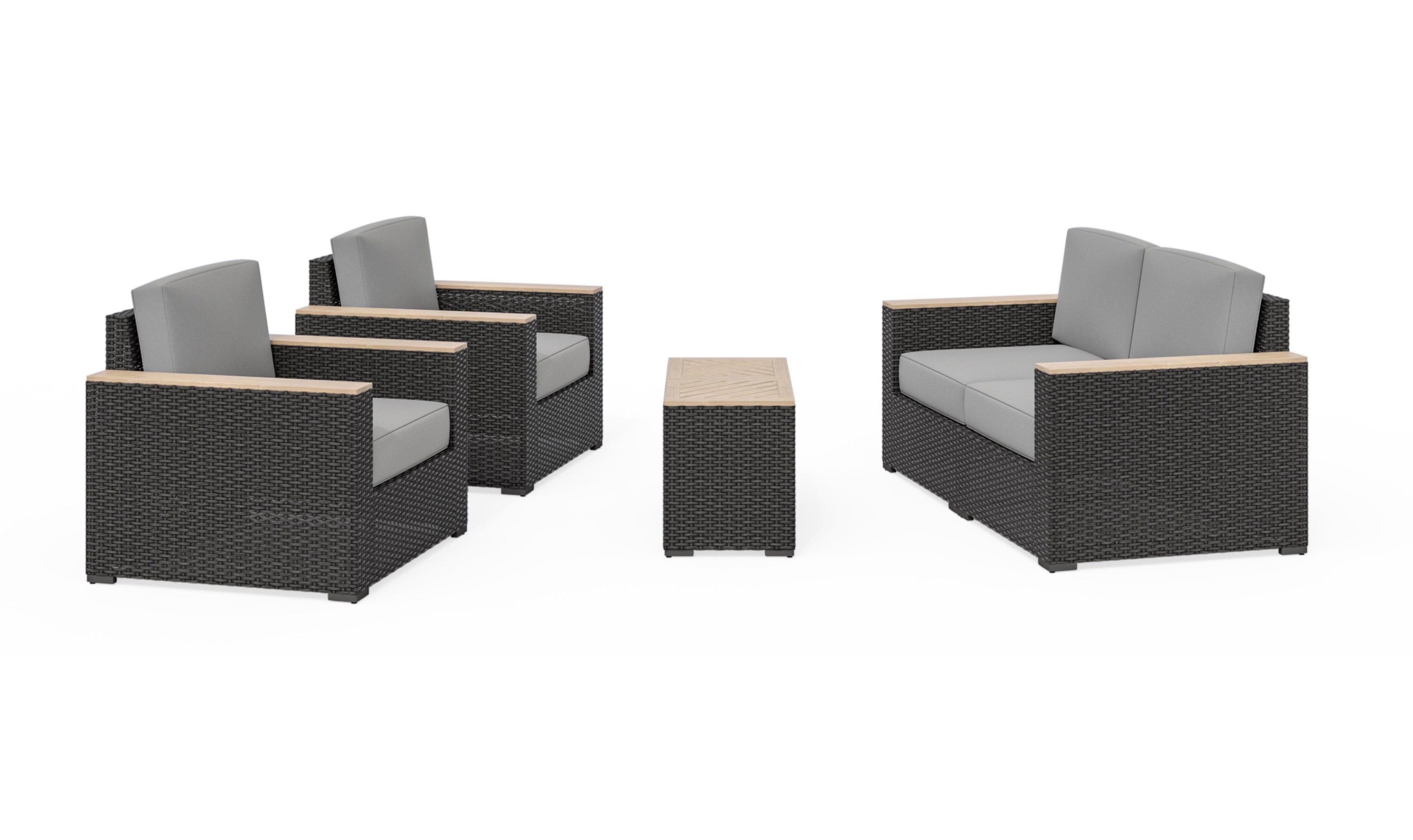 The Homestyles Sustain Outdoor Lounge Set transforms any outdoor space into a comfortable seating area for relaxation or casual entertaining. This three-piece set includes two lounge chairs and a coordinating end table, creating a practical arrangement for two people. The set is constructed from gray acacia wood, known for its durability and natural resistance to water, ensuring long-lasting use. A protective UV-resistant finish helps the wood maintain its appearance even under prolonged sun exposure.