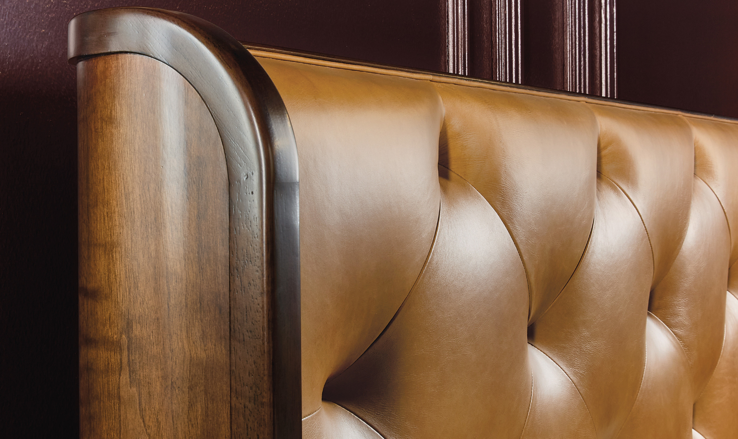 The Archives King Leather Bed blends fine craftsmanship with refined detailing to create a statement piece for the bedroom. Its Classic Walnut finish, applied over figured walnut veneers, adds rich depth and character, while the tufted headboard in Dark Blond semi-aniline top-grain leather provides a tactile, inviting surface. The winged design frames the headboard with subtle elegance, supported by eight tapered legs that enhance its grounded yet sophisticated profile.