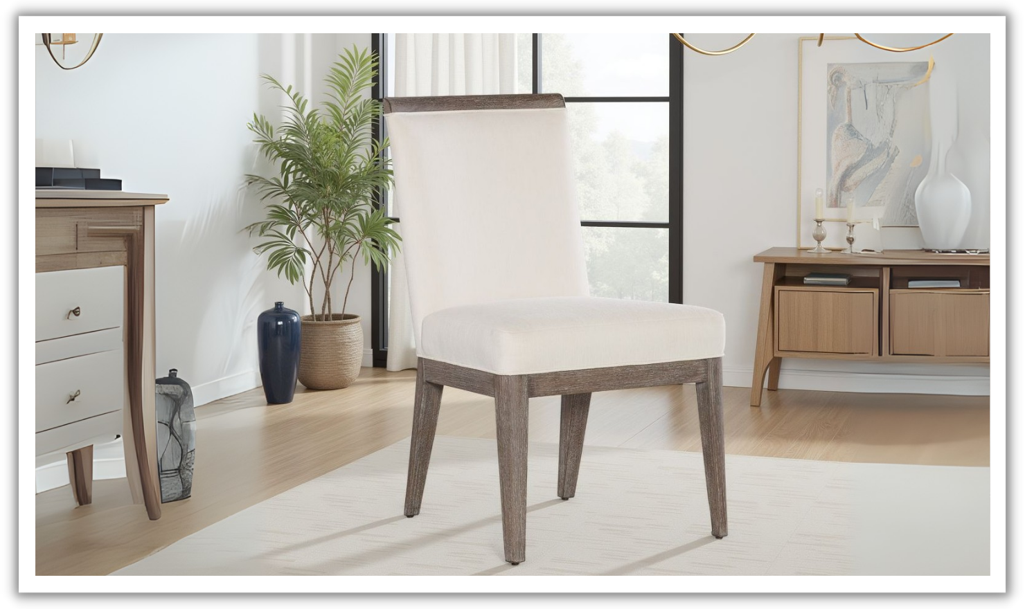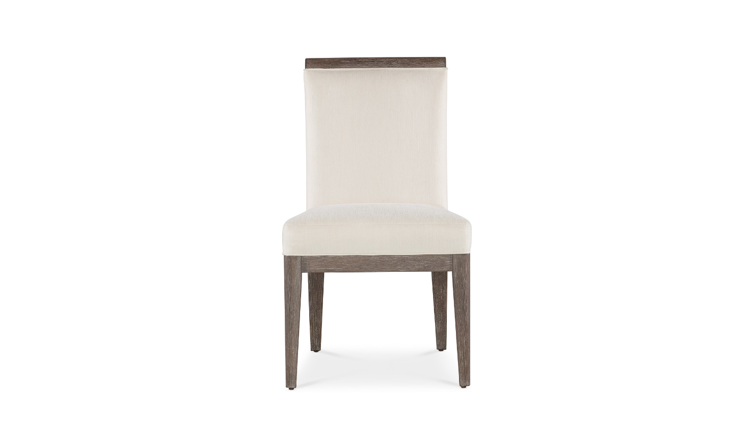 The Hooker Furniture Modern Mood Upholstered Side Chair blends comfort with refined modern design. Its gently cushioned seat and back are upholstered in soft Cottony Cotton fabric, offering a welcoming feel for long dinners or casual gatherings. The chair’s clean lines are enhanced by a wood trim along the top, with a sturdy wood base and legs crafted from flat-cut quartered oak veneers. The dark Mink finish, with its earthy brown tones and subtle black accents, brings a timeless sophistication that fits seamlessly into a variety of dining spaces.
