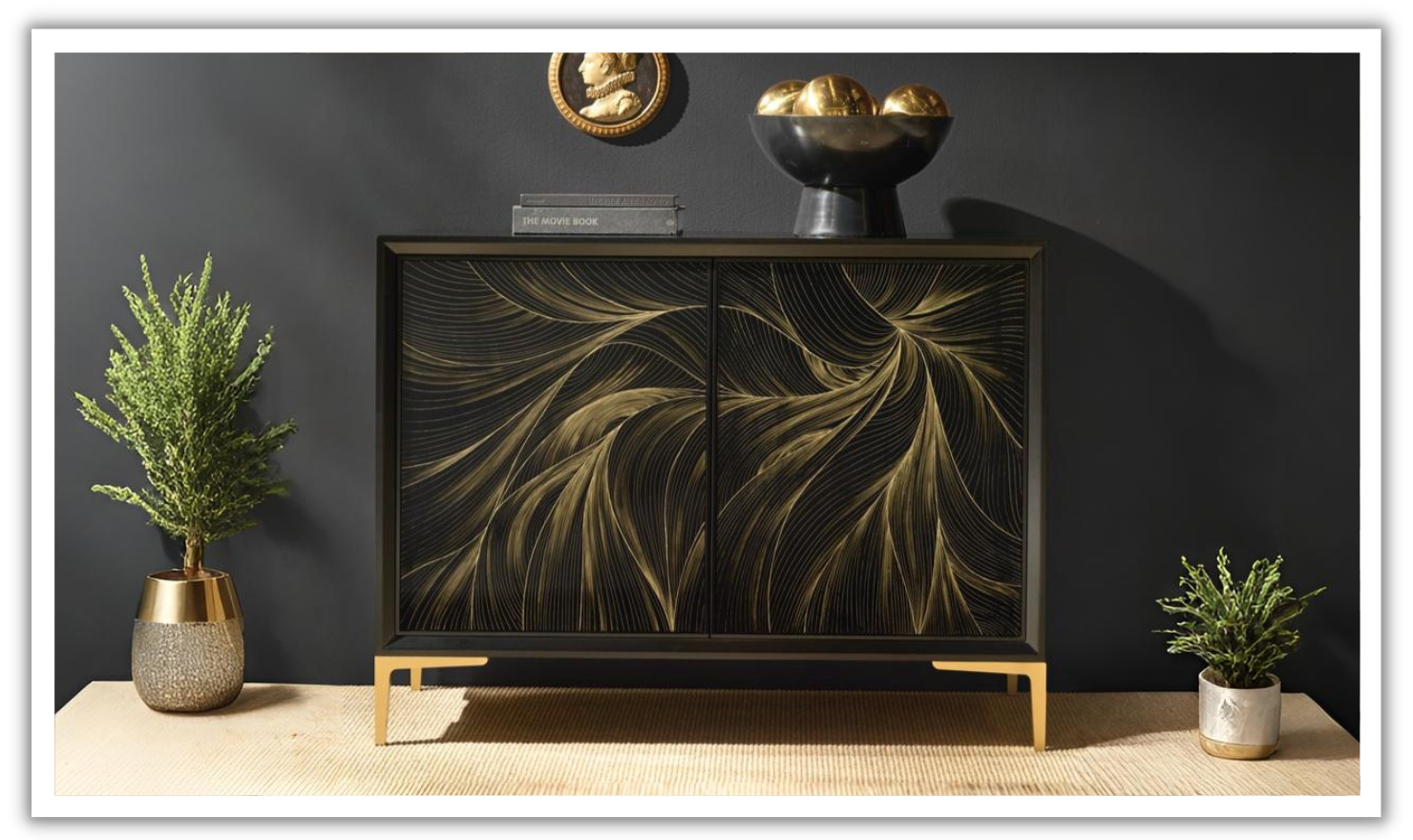 The Melange Willow Hall Chest offers a refined blend of artistry and utility, crafted to complement a variety of interiors. Its black-finished exterior is contrasted with glass door fronts, painted in a gold abstract willow motif, creating a striking focal point in any room. Two touch-latch doors with soft-close hinges open smoothly to reveal an adjustable wooden shelf, allowing you to adapt the storage space to your needs.