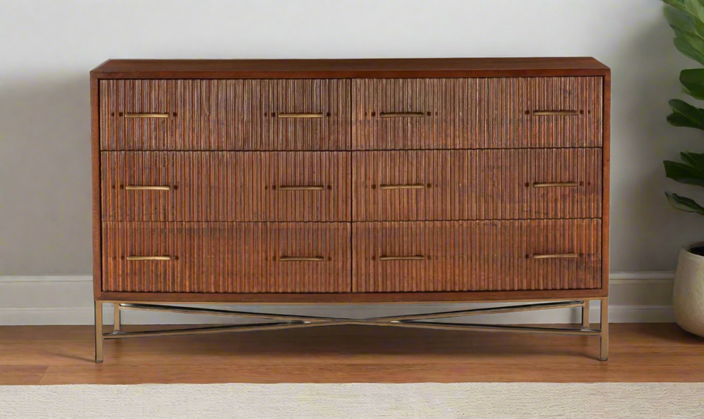 The Cosmopolitan Six Drawer Dresser in Honey Brown with an Iron Base offers a practical and stylish solution for bedroom storage. Crafted from sturdy mango wood, the dresser features a honey brown finish that highlights the natural grain of the wood, adding warmth and character to your space. The six spacious drawers provide ample room for organizing clothing, accessories, and other personal items, while the iron base ensures stability and durability.