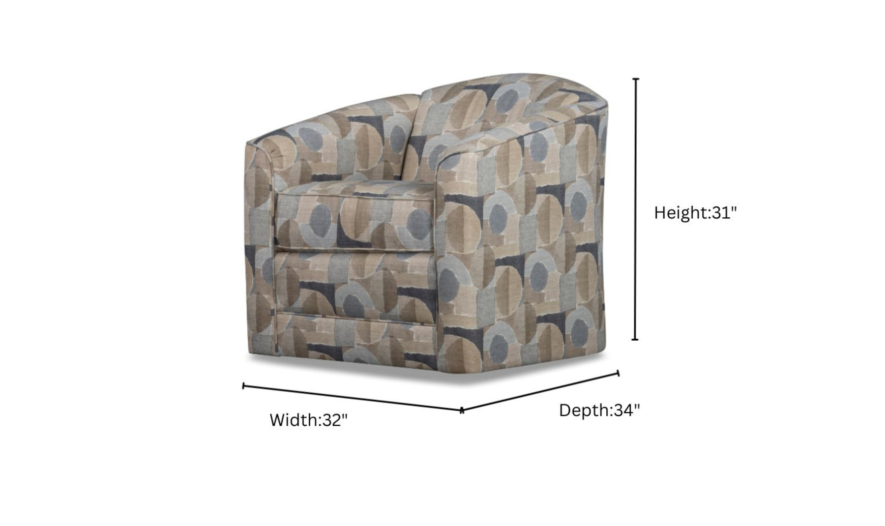 The Klaussner Jasper Swivel Chair combines modern functionality with timeless design. Measuring 35 inches wide, 30 inches deep, and 30 inches high, this chair is compact yet offers ample comfort. Its rounded arms provide a soft, inviting silhouette, while the tight back design ensures sturdy, supportive seating. The swivel feature adds versatility, allowing you to easily change direction without moving the chair.