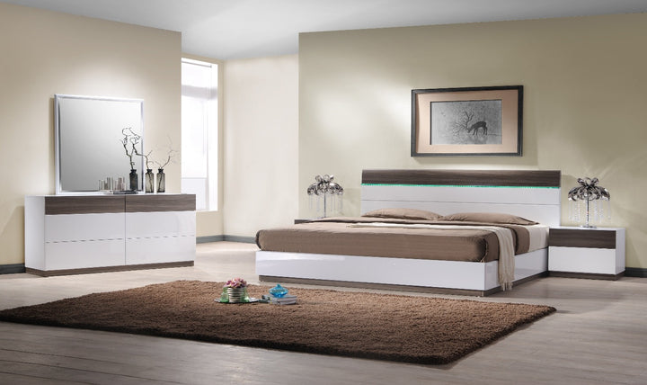 Jennifer is proud to present the Montgolfiere Lit ll Bedroom. Available in two different versions, This bed features a visually striking contrast between a Walnut Veneer & a gorgeous white lacquer. The head board features L.E.D's on the headboard that can be switched on or off to easily change the ambience of any bedroom. The Casegoods gorgeously compliment the bed, & feature full extension drawers for durability. Available in both Queen & King Sizes.