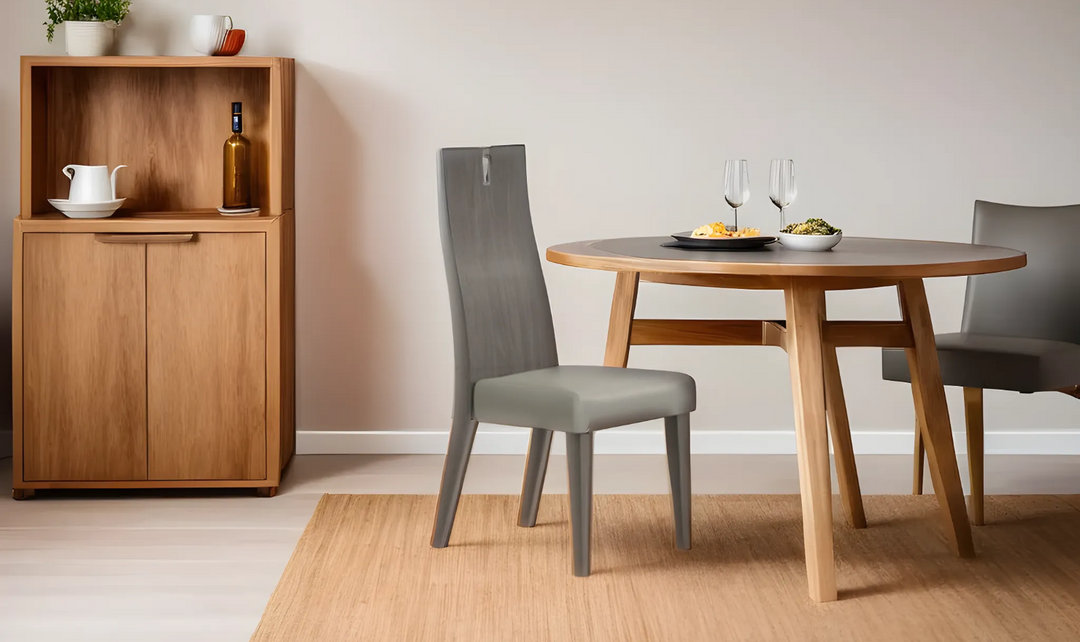 - Upholstered chair seats in taupe finish