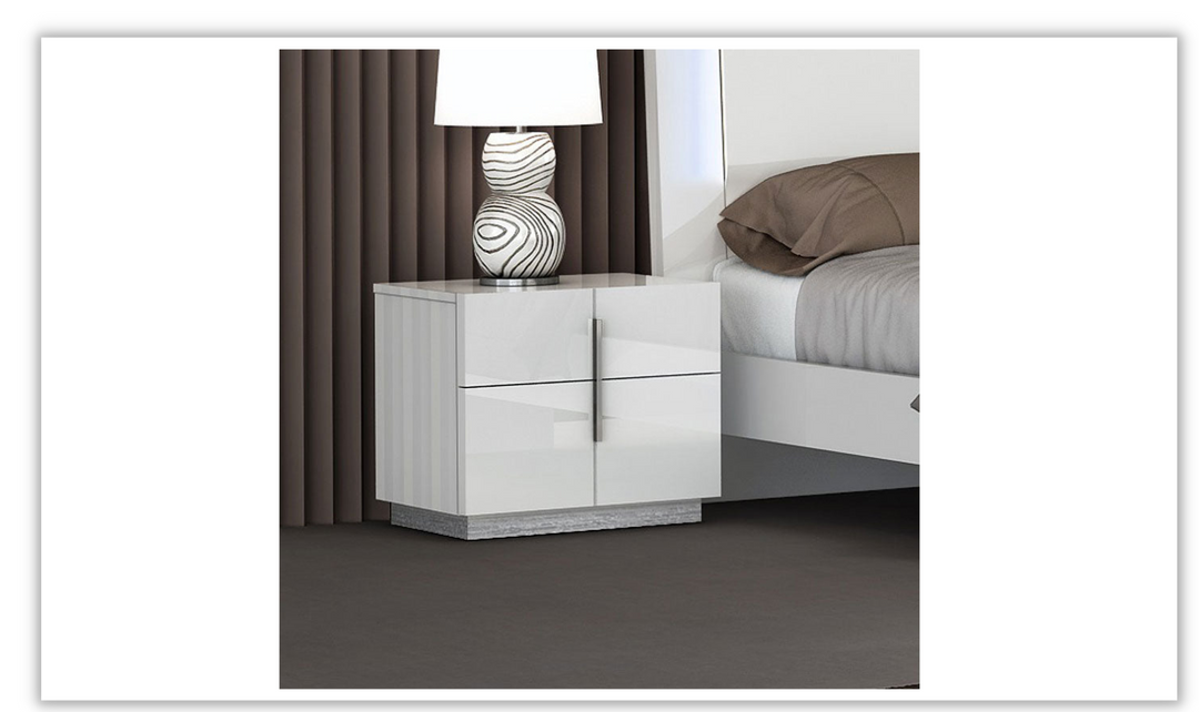 Jennifer is proud to introduce our newest addition to our thoughtfully crafted nightstand. The Ellica premium Nightstand features a superb design that integrates sophistication with simplicity. Crafted in white Lacquer, this set is adorned by clean chrome handles for just the right look. The case goods feature premium soft-close drawers, and the bed features a full wooden platform to eliminate the need for a box spring.