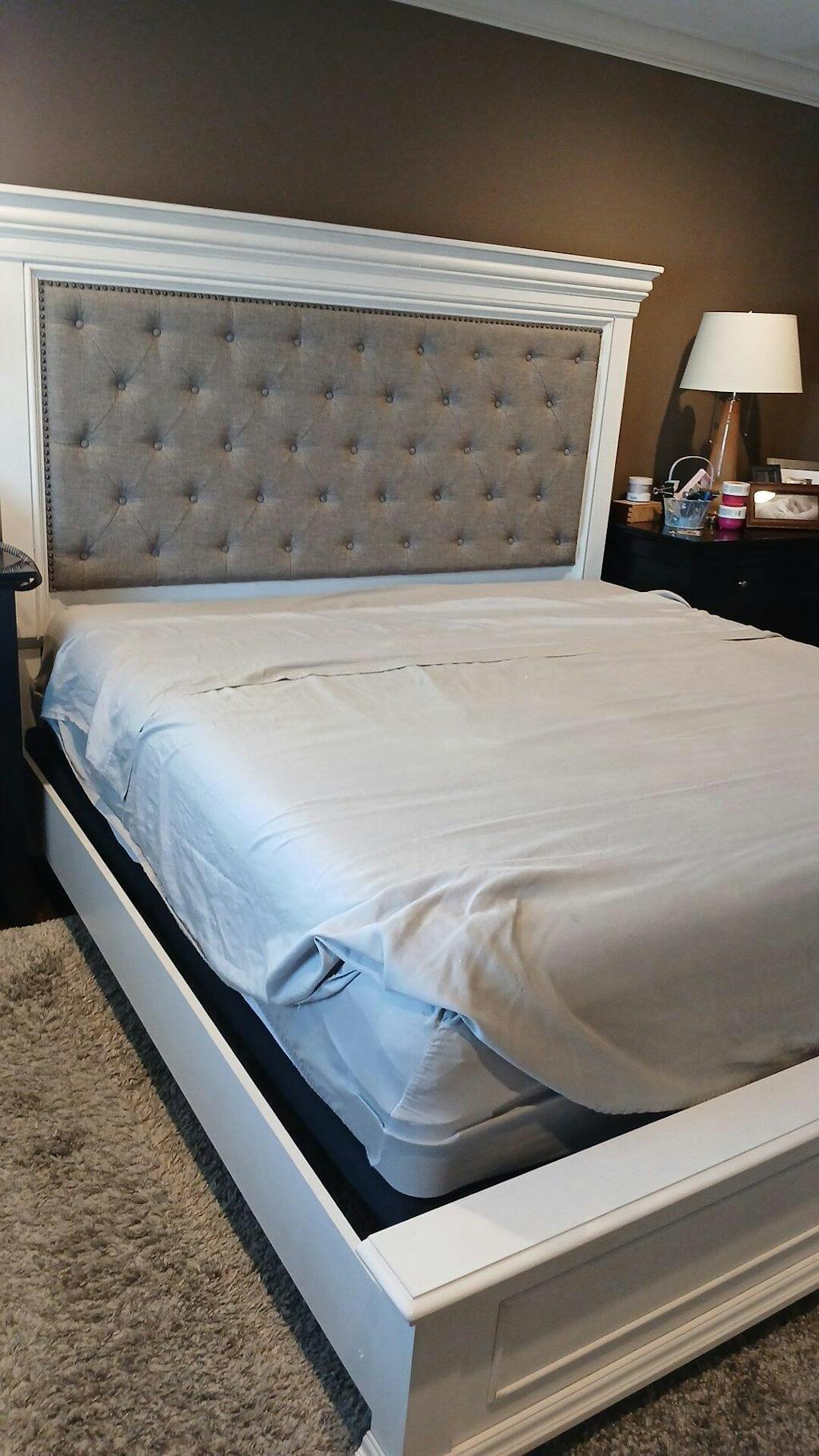 - Includes king and Queen upholstered panel headboard, Storage footboard, and rails.