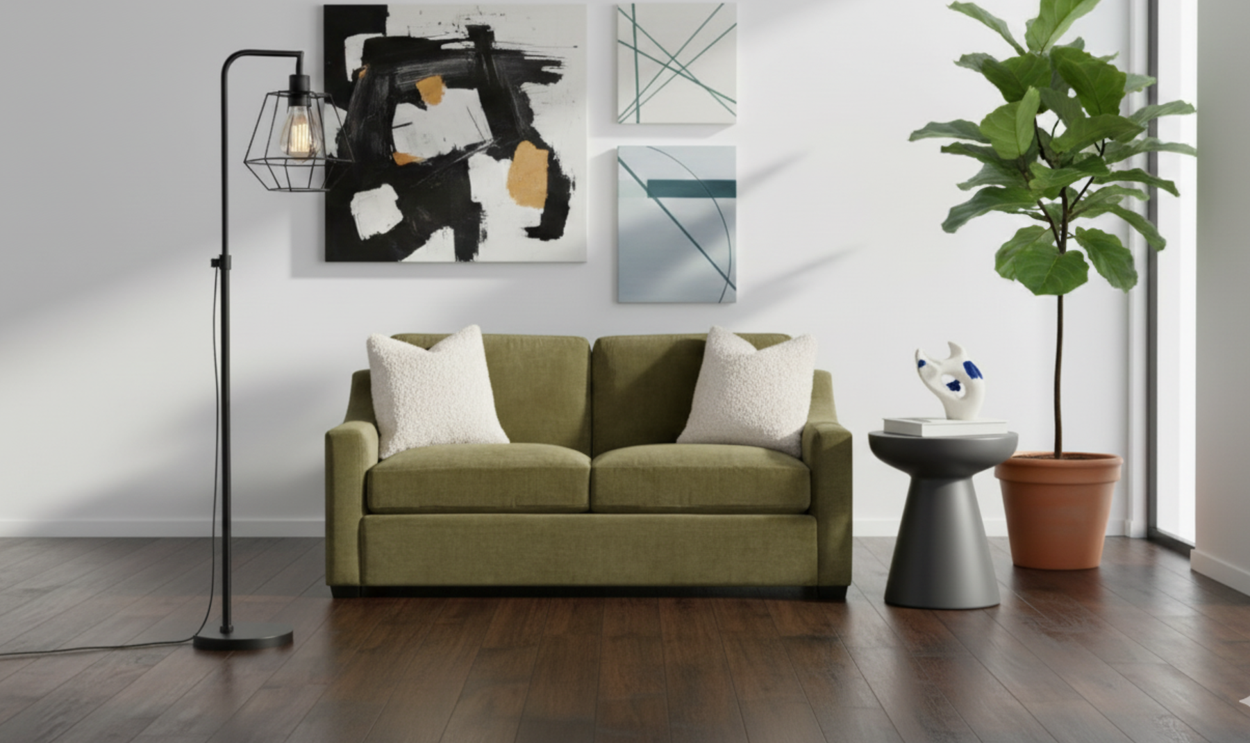 The olive green fabric finish enhances its inviting charm, seamlessly blending with a variety of décor styles. Built for longevity, this sofa combines high-quality craftsmanship with a design that prioritizes both aesthetics and practicality.