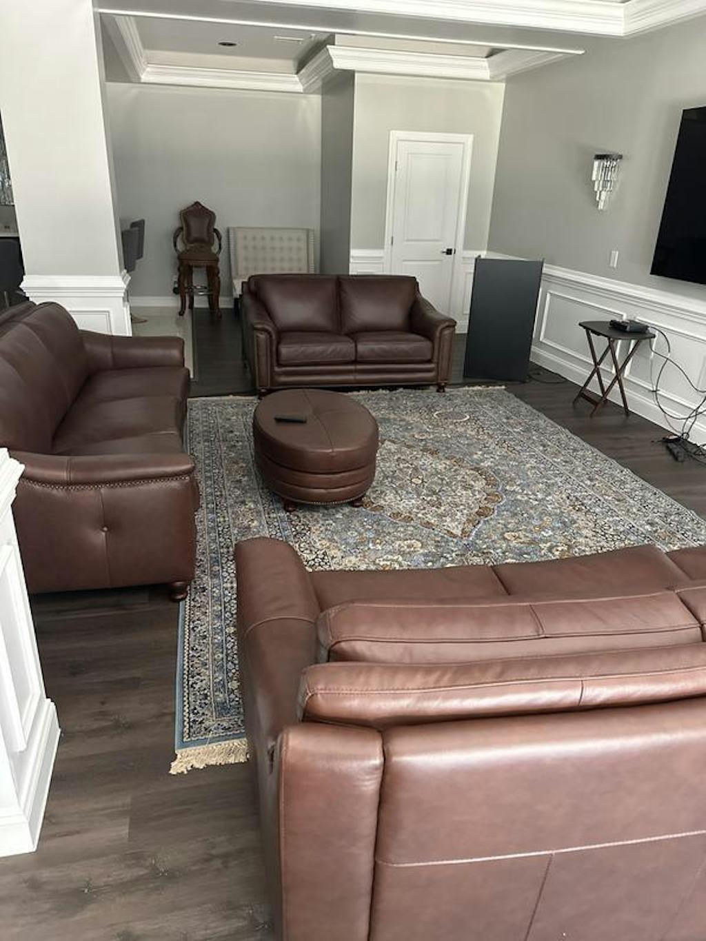 - Top-grain leather on seating, split-grain on sides and back.