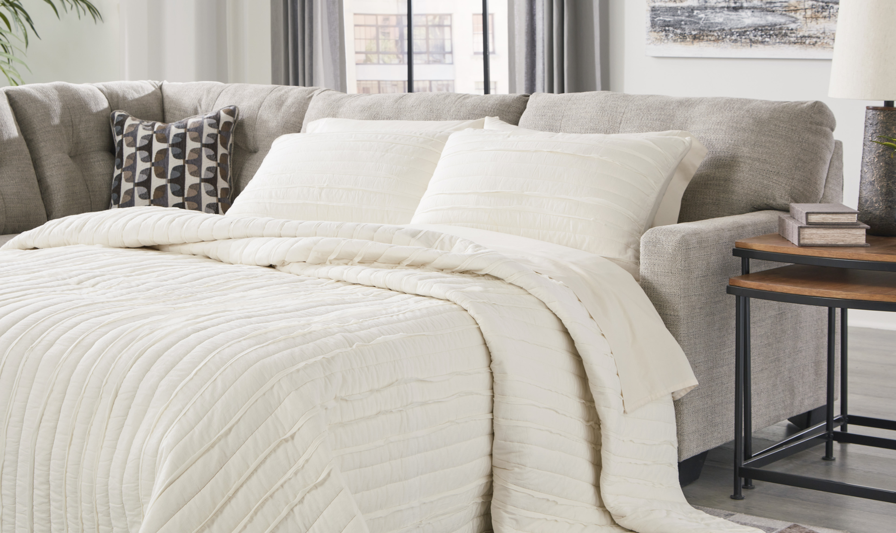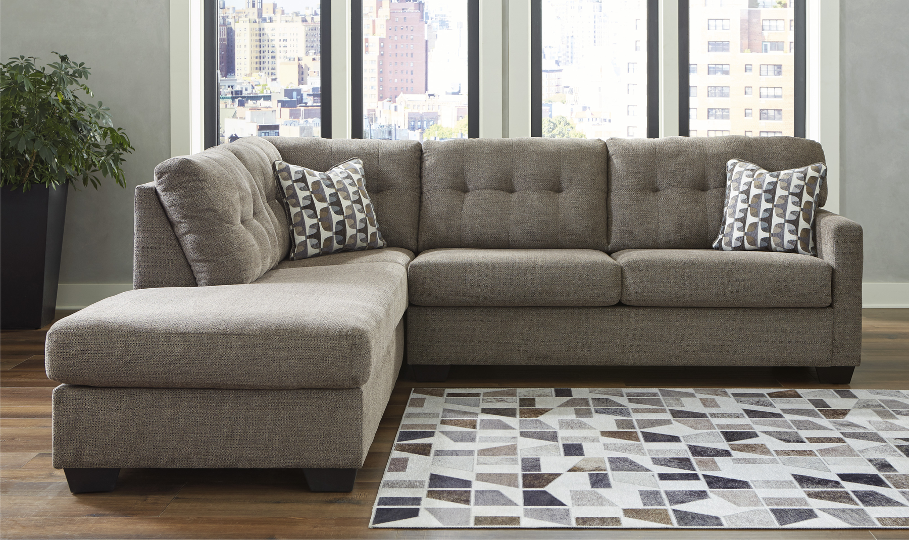 Mahoney 2-Piece Sleeper Sectional with Chaise in Fabric, where comfort meets functionality in style. This sectional expertly blends classic tufted details with contemporary design for an approachable yet sophisticated look. With a corner-blocked frame and high-resiliency foam cushions wrapped in thick poly fiber, durability and comfort are guaranteed.