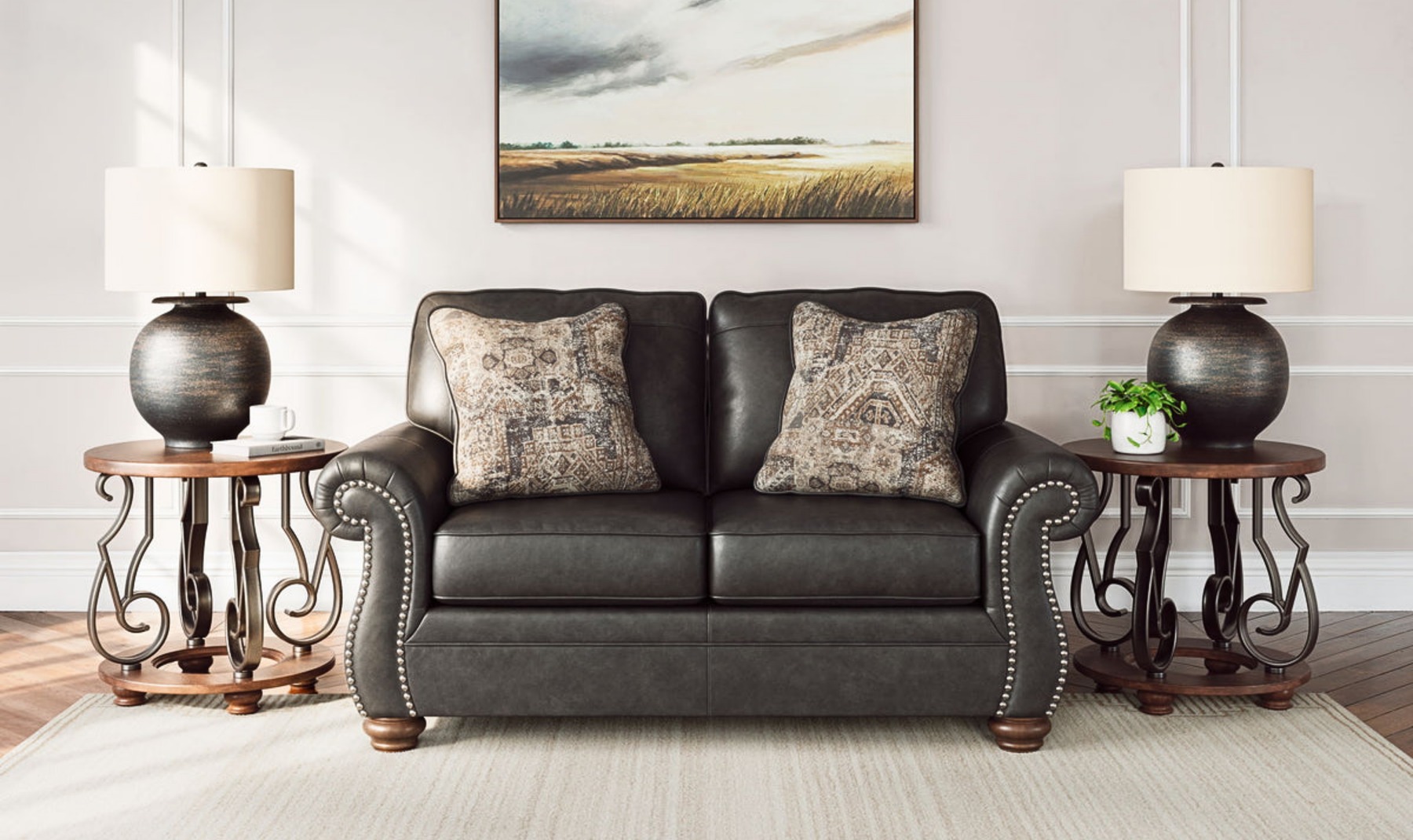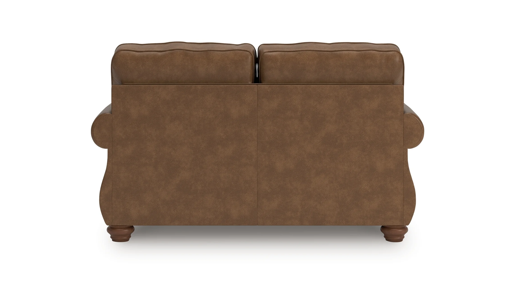 The Chasemore Loveseat reflects a traditional design with familiar details and comfortable proportions. Its rolled arms are outlined with decorative nailhead trim, giving the piece a defined, classic profile. Upholstered in faux leather with a rustic finish, the loveseat offers a warm, grounded look that pairs easily with both traditional and transitional interiors. Included chenille accent pillows with a distressed motif add visual texture and additional comfort.