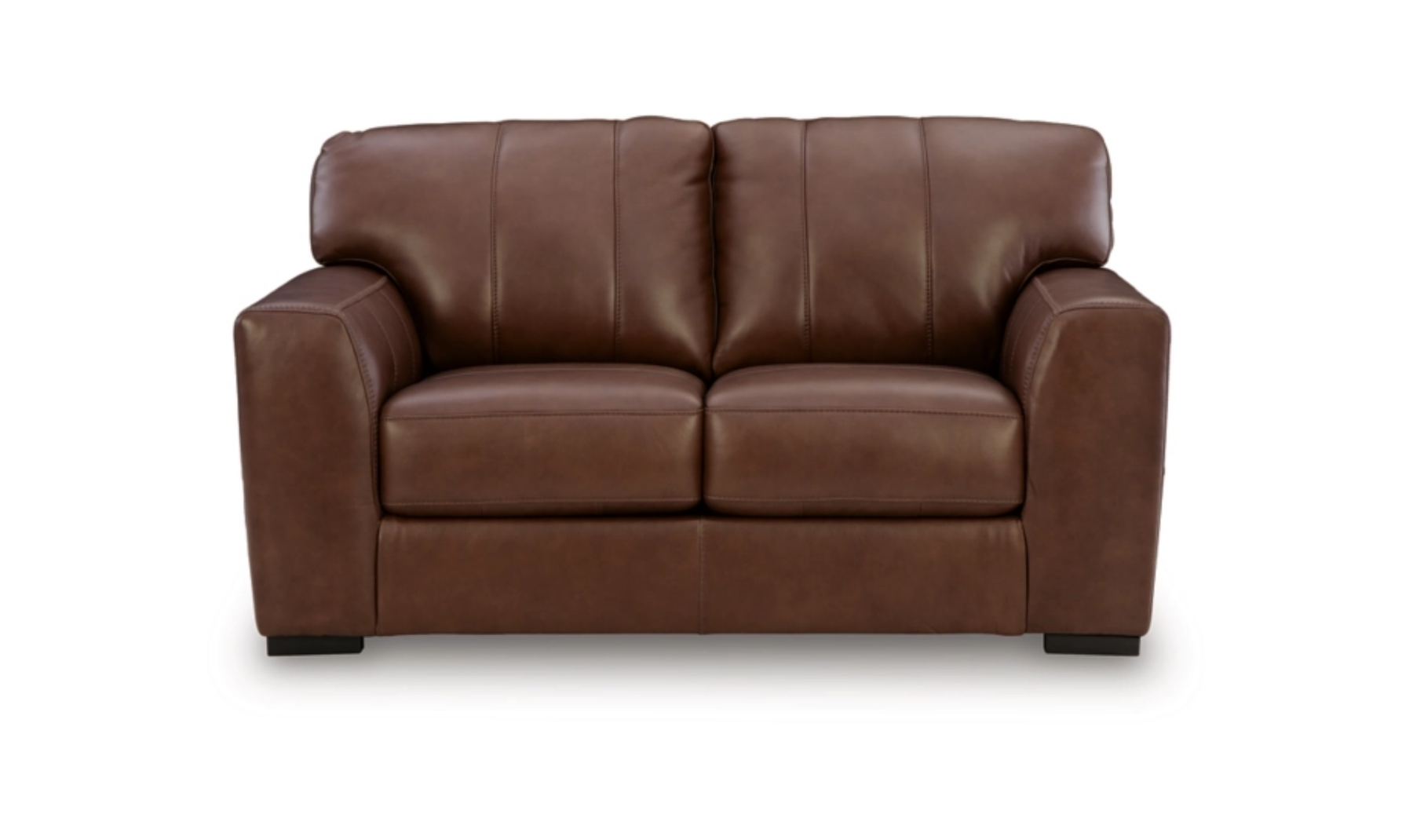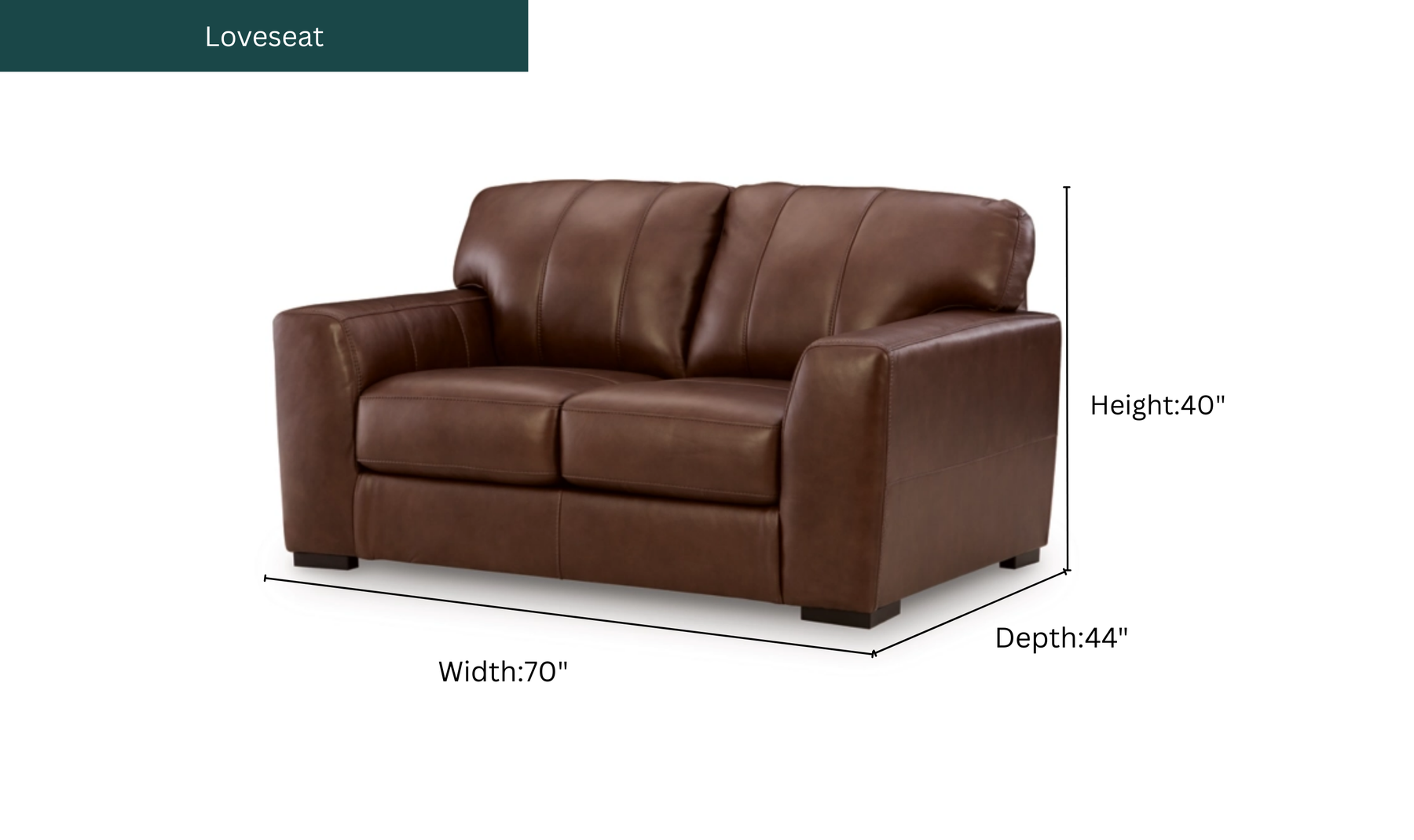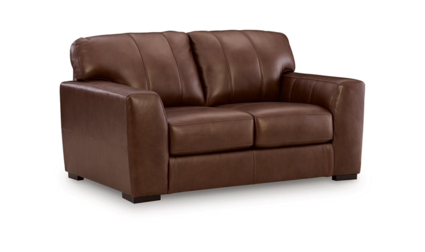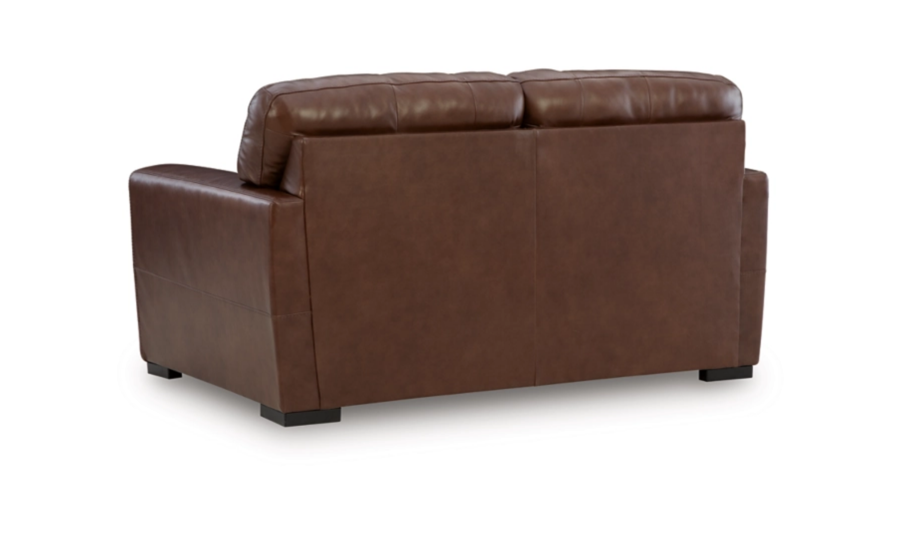 Upholstered in top grain leather across the seating areas, the loveseat offers a soft, durable surface where it matters most, while carefully matched faux leather completes the sides and back for a cohesive appearance. Natural markings in the leather give each piece subtle character, reflecting the material’s authenticity. A sturdy platform foundation and low-profile accent legs provide long-lasting support and stability, helping the loveseat maintain its shape and comfort over time.