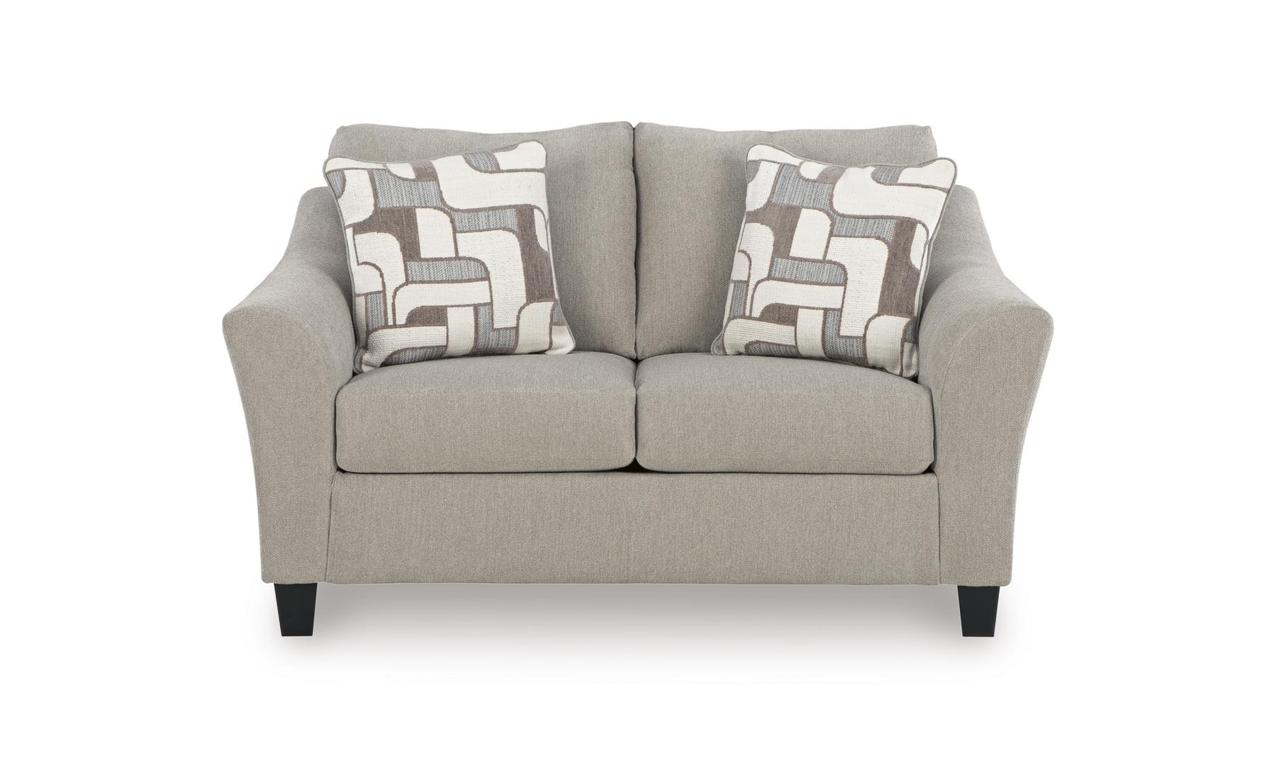 Designed for both comfort and practicality, the loveseat features supportive foam cushions wrapped in poly fiber and a sturdy corner-blocked frame. The loose seat cushions make routine cleaning easier, especially in busy homes with kids or pets, while the platform foundation system helps maintain consistent support over time. Tapered accent legs with a faux wood finish add a refined touch without overpowering the overall design.