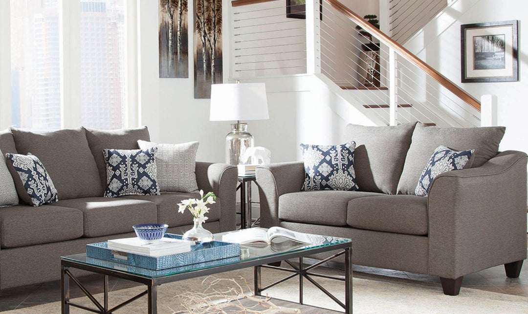 Introducing the Coaster Furniture Salizar Stationary Cushion Back Loveseat in Charcoal Gray – a timeless piece designed to infuse your living room with understated elegance. Its compact size makes it an ideal choice for smaller spaces, while the neutral charcoal grey upholstery effortlessly blends with a variety of décor styles. Crafted with a sturdy frame, this loveseat offers the perfect balance of style and comfort. The high-density, full-foam seat cushions provide firm, supportive seating, while the flared arms and welt framing add a touch of sophistication. Decorative accent pillows complete the look, offering added comfort and visual interest. Whether placed in a cozy nook or as part of a larger seating arrangement, this loveseat brings a sense of casual glamour to any room.