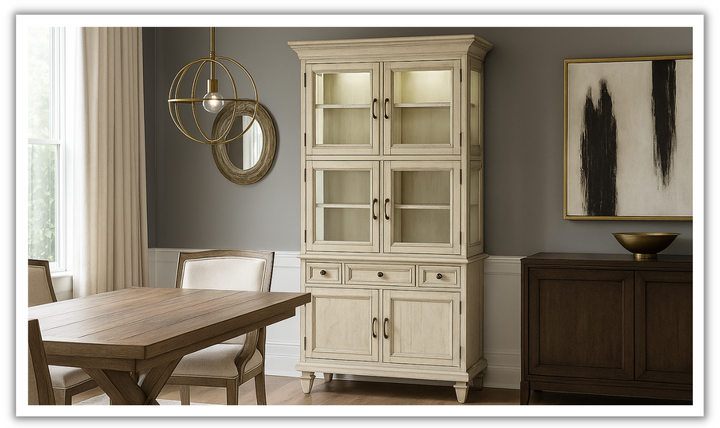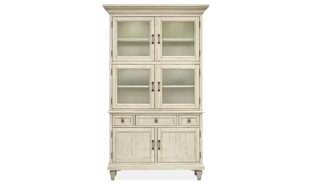 - 2 adj. wood framed glass shelves w/plate grooves and 1 fixed wood framed glass shelf w/plate grooves behind the doors.