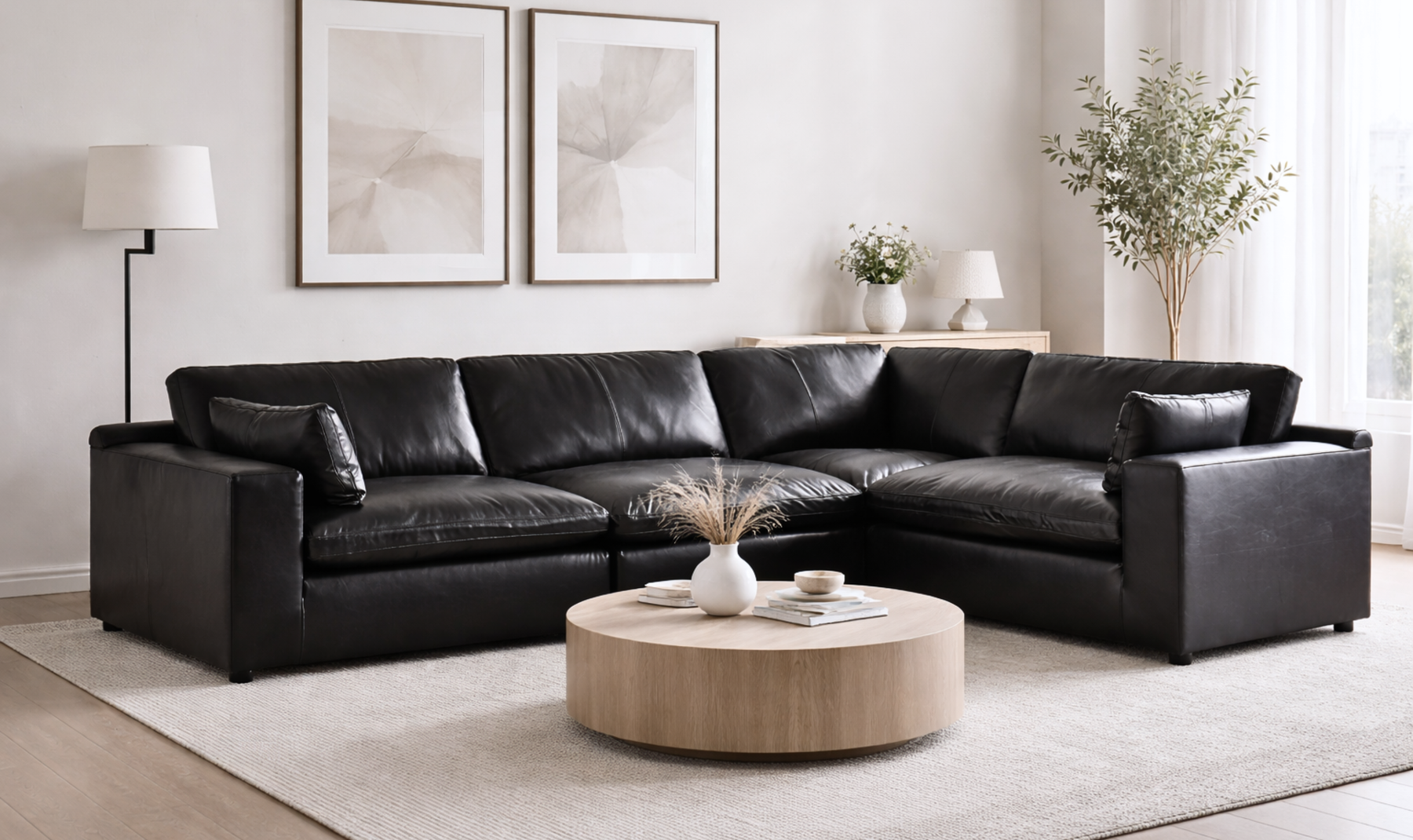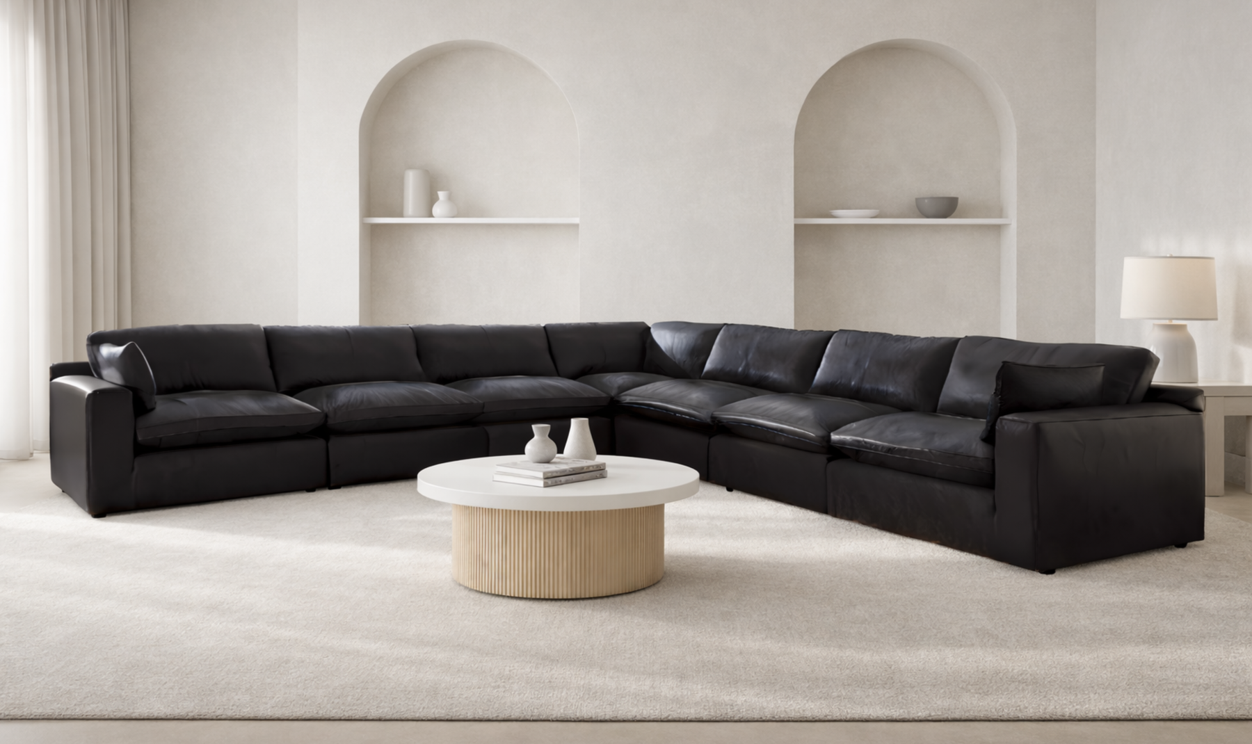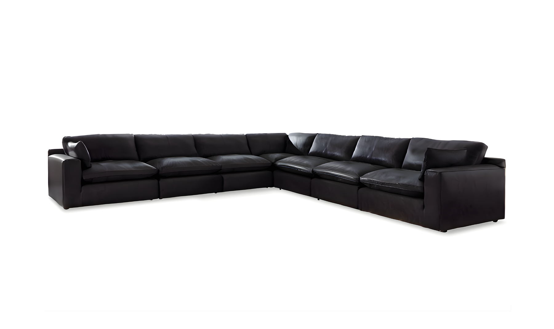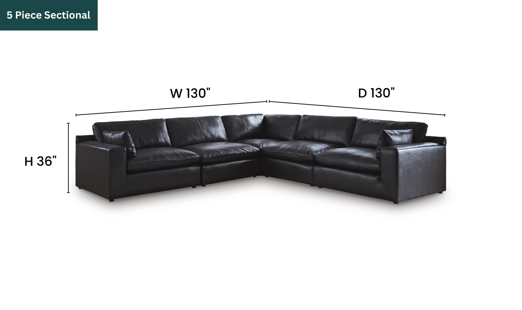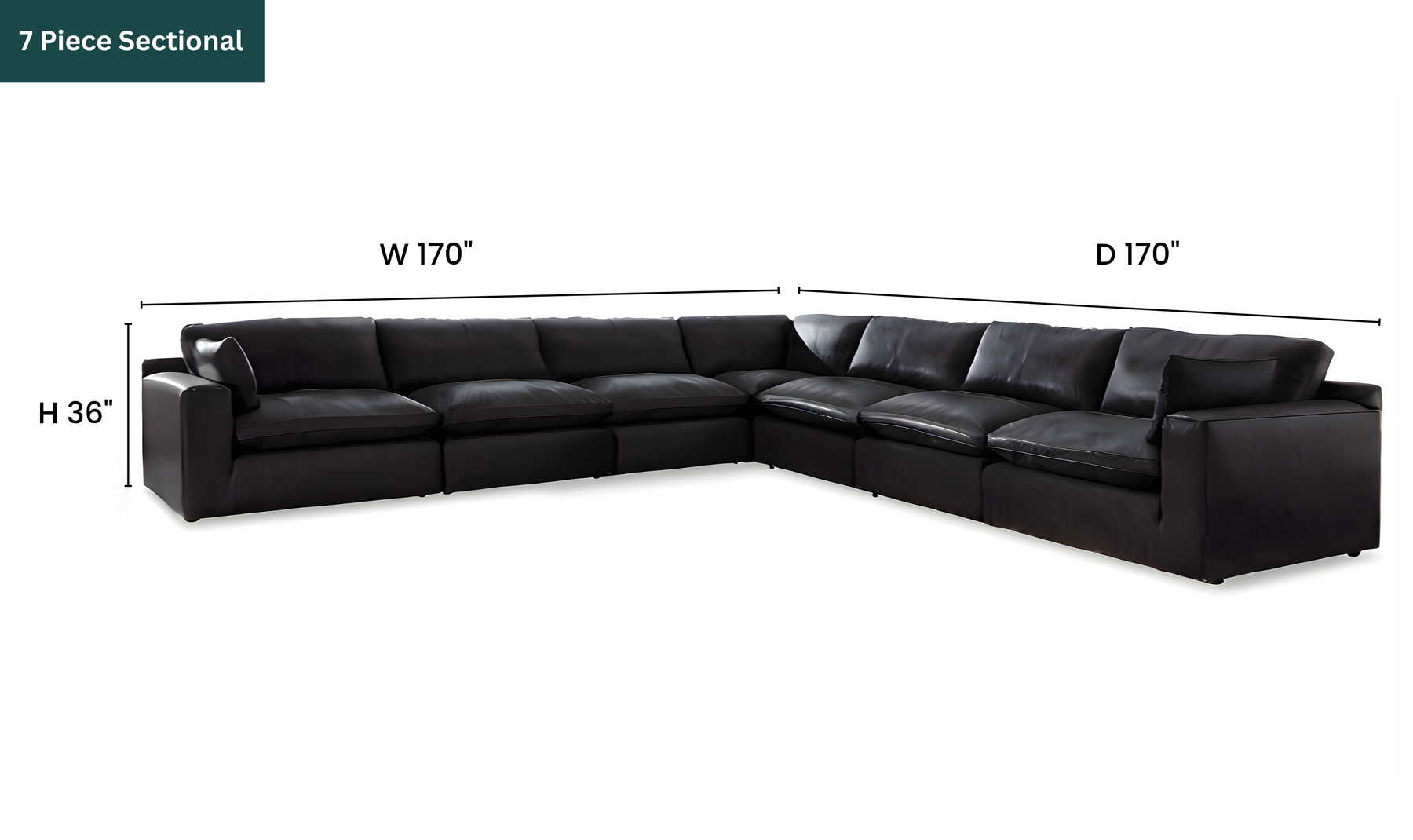 The Modern Heritage Emilia Leather Sectional in Black is a luxurious, contemporary modular seating solution designed to elevate your living space with both comfort and style. This versatile sectional includes five individual pieces - a left-arm facing corner chair, two armless chairs, a wedge, and a right-arm facing corner chair - that can be arranged in multiple configurations to suit your room layout or lifestyle needs. Each module is fully finished on all sides and can stand alone without connectors, making it perfect for flexible placement, conversation areas, or large gathering spaces. It comes with 4 piece, 5 piece, 6 piece, 7 piece depending on customer need.