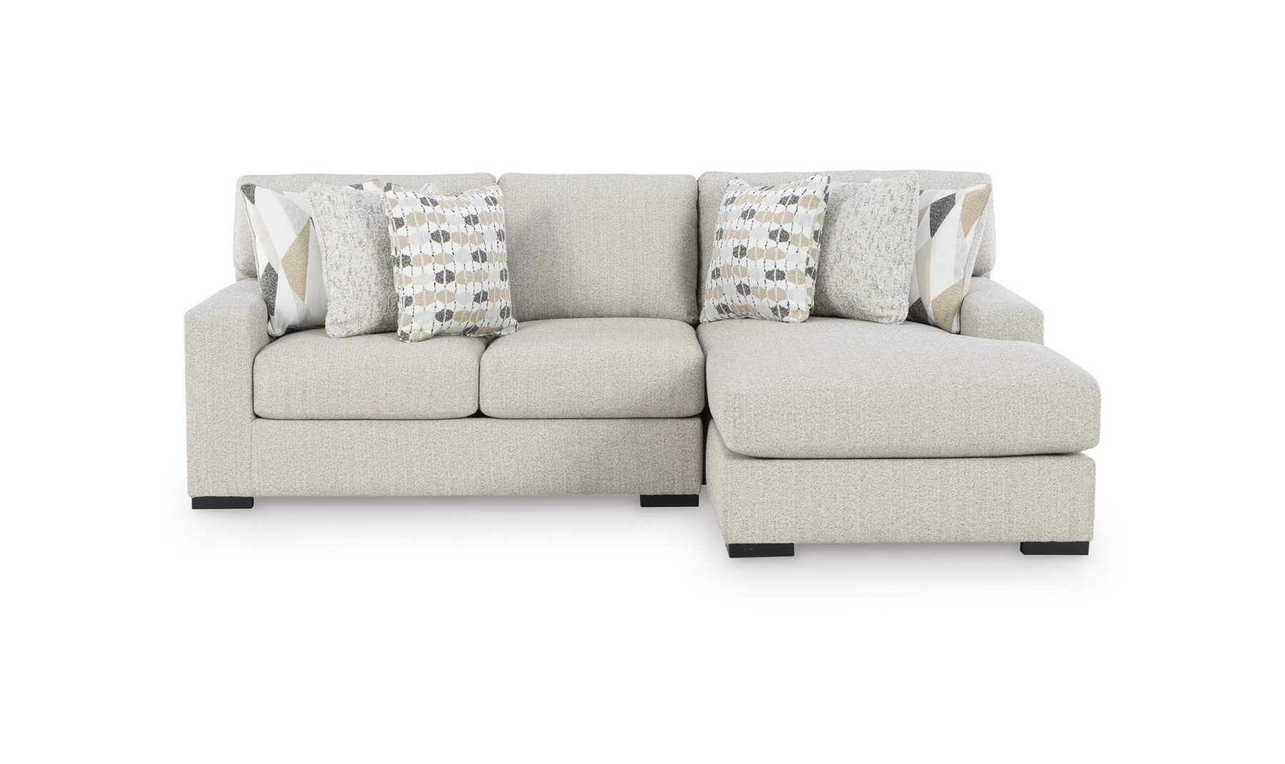 The Modern Heritage Laurelgrove 2-Piece Sectional Sofa Chaise is designed to anchor a living room that values comfort and practicality. Its clean track arms, balanced proportions, and neutral upholstery allow it to blend easily with both casual and contemporary interiors. The chaise invites everyday lounging, while the corner-blocked frame and supportive platform foundation provide a stable structure that holds its shape over time.